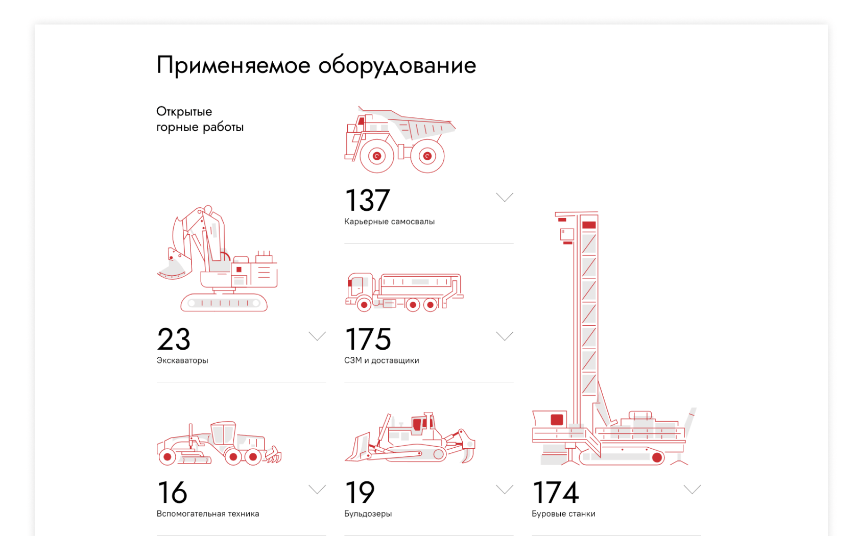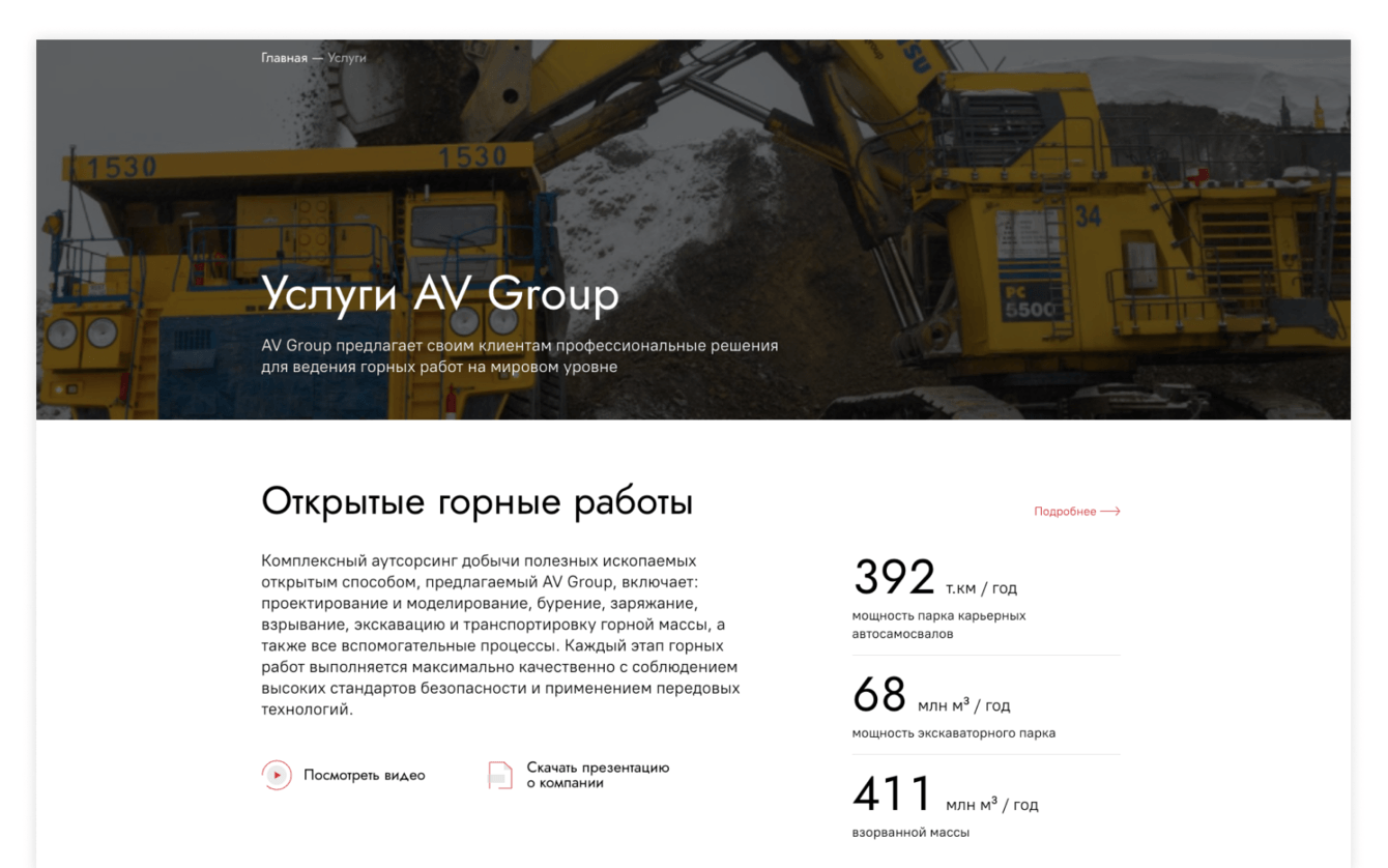 Детально проработали и структурировали информацию о продуктах компании. Расписали оба вида услуг — открытые и подземные горные работы. Сделали акцент на преимуществах работы с AV Group. Дали информацию о клиентах, кейсах, оборудовании. Для представления оборудования сделали специальные иллюстрации в стиле сайта. Добавили отзывы клиентов компании, блок о лицензиях и разрешениях. Предоставили пользователям сайта возможности посмотреть видео о работе компании, скачать перезентацию о её услугах, оставить заявку.