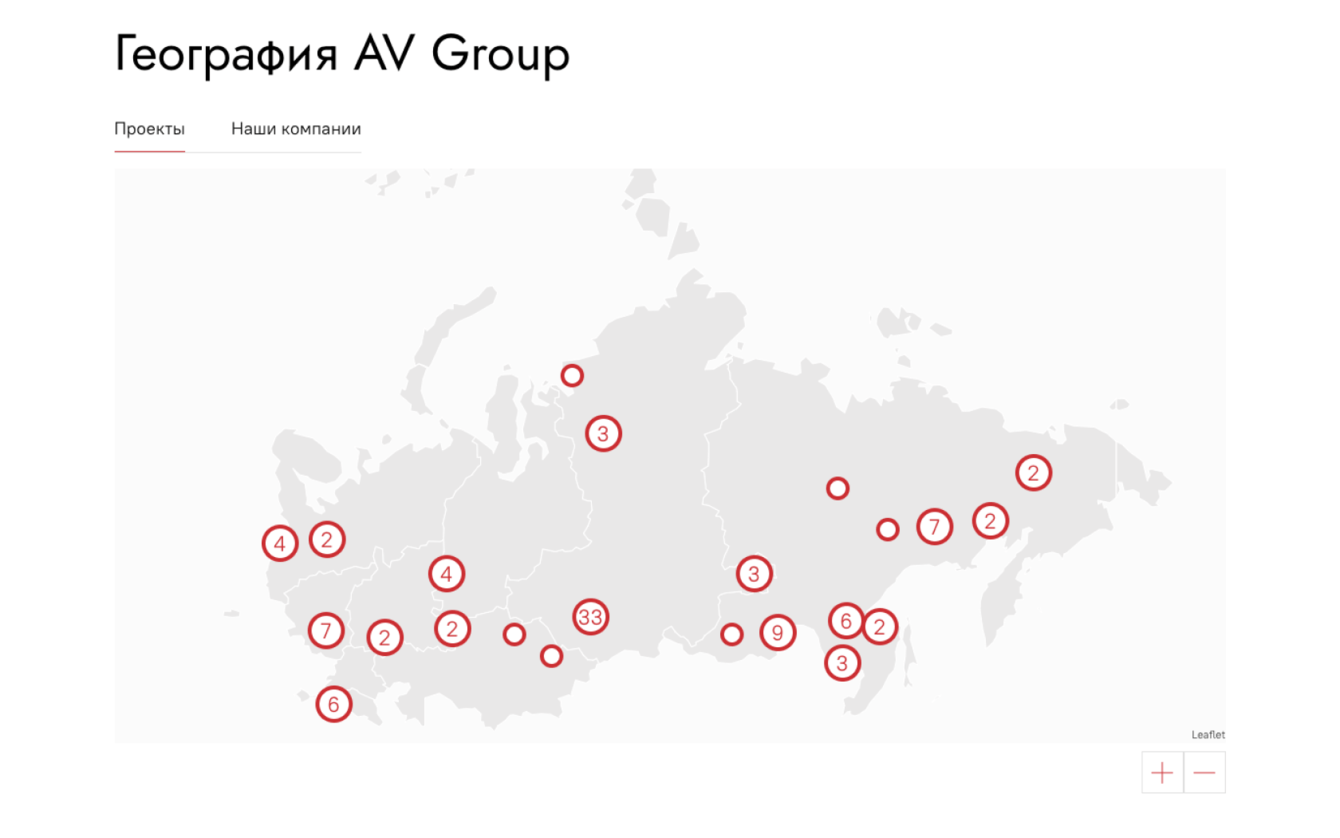 Сформулировали преимущества сотрудничества с AV Group, показали с анимацией ключевые факты о компании в цифрах. Структурировали информацию о продуктах и услугах, иллюстрировали и дали данные о парке техники. Рассказали о клиентах компании. Сделали интерактивную карту о географии присутствия компании в стране. Рассказали о миссии, ценностях компании, её менеджменте. Представили интерактивный таймлапс истории компании.