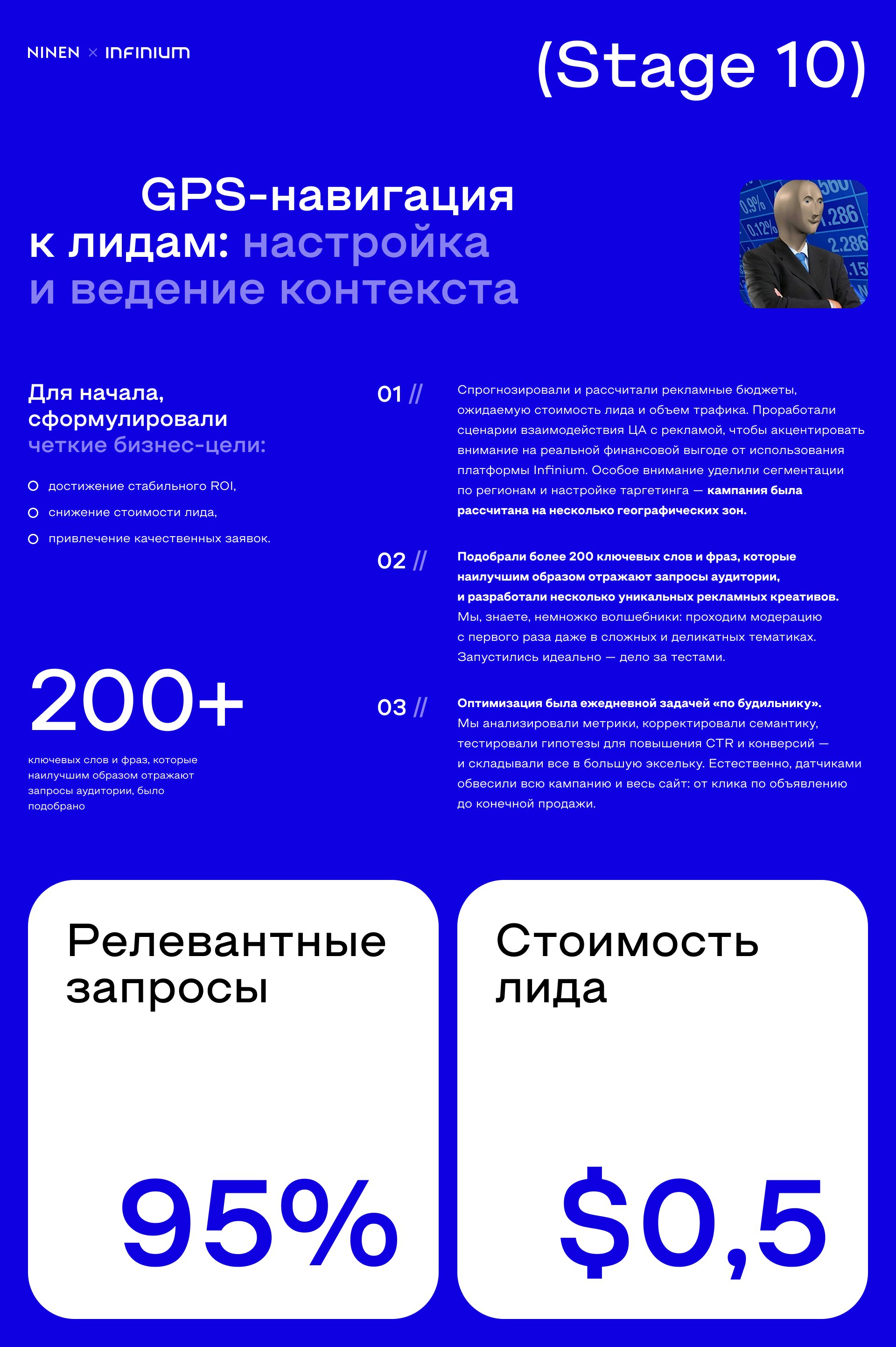Модерация с первого раза в сложных и деликатных тематиках — that’s what Ninen does. Но самое главное в любой рекламе — оптимизация кампаний, причем ежедневная, «по будильнику». Мы регулярно анализировали метрики, отслеживали достижение KPI, вносили корректировки в семантику, тестировали гипотезы, чтобы повысить и CTR, и конверсию. И всё это фиксировали. Вся кампания и весь сайт были обвешаны «датчиками». Клик, подписание договора — от нас не спрячешь ничего.