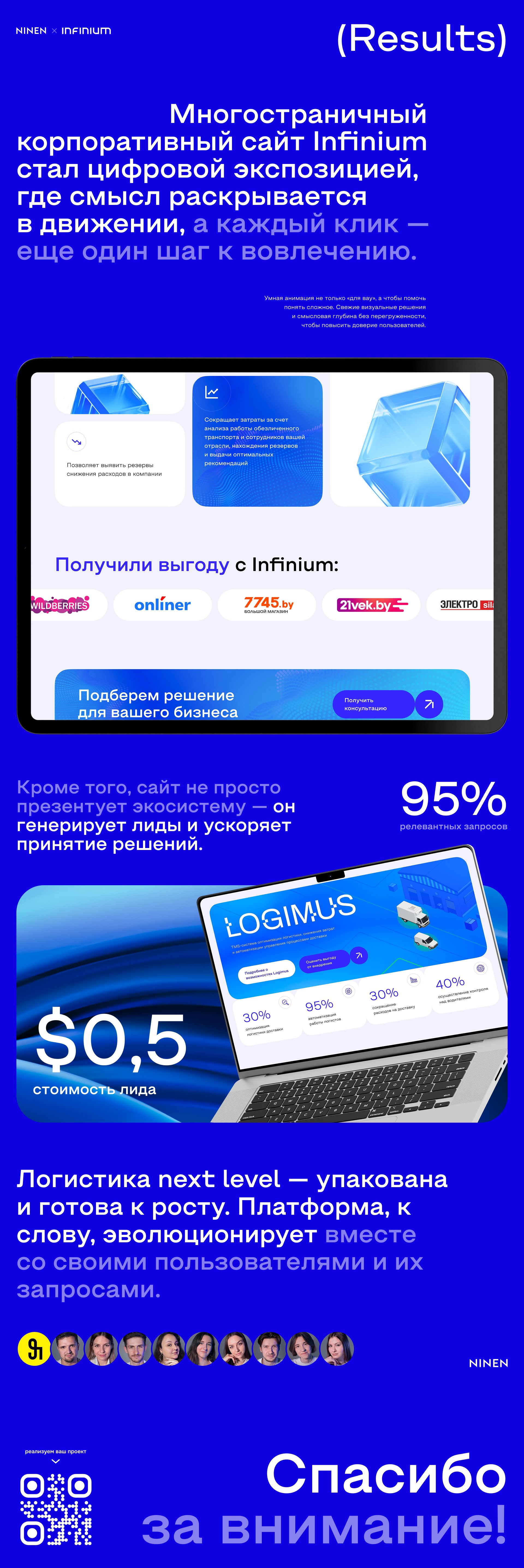 Многостраничный корпоративный сайт Infinium стал цифровой экспозицией, где смысл раскрывается в движении, а каждый клик — еще один шаг к вовлечению. Умная анимация не только «для вау», а чтобы помочь понять сложное. Свежие визуальные решения и смысловая глубина без перегруженности, чтобы повысить доверие пользователей.