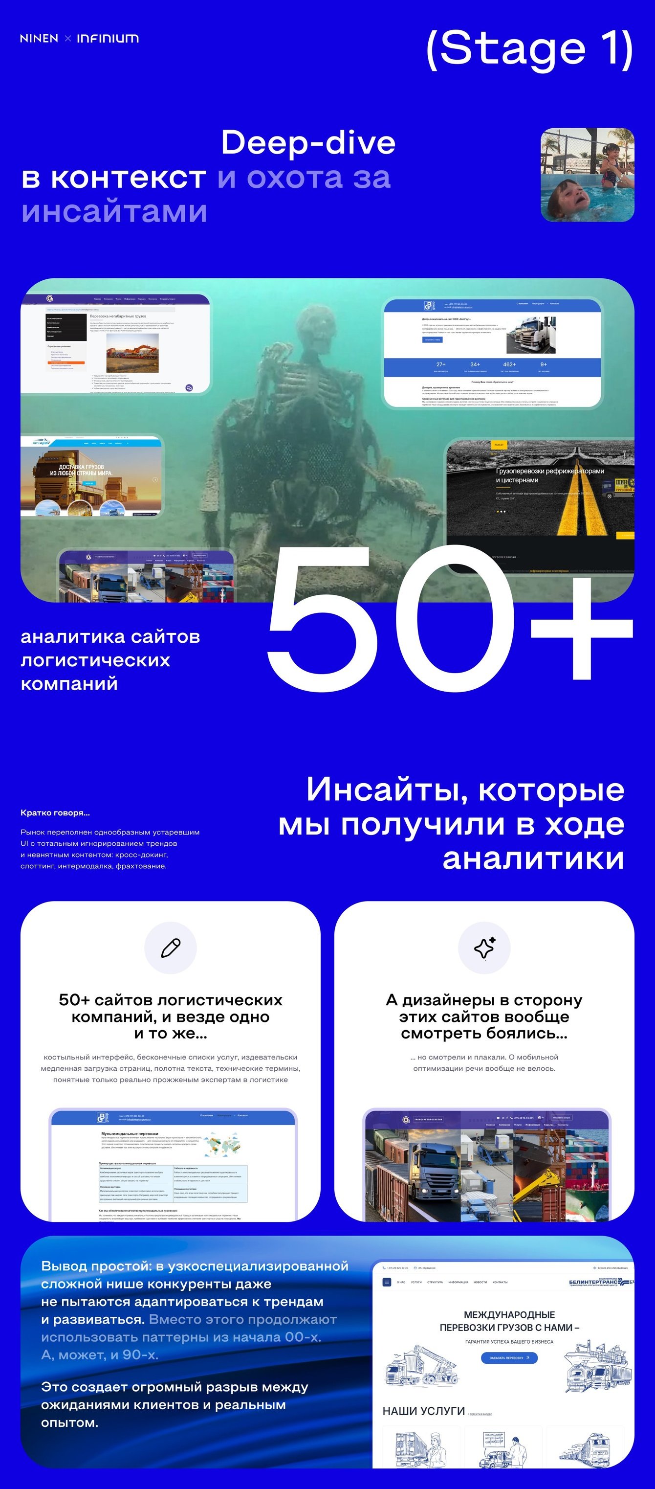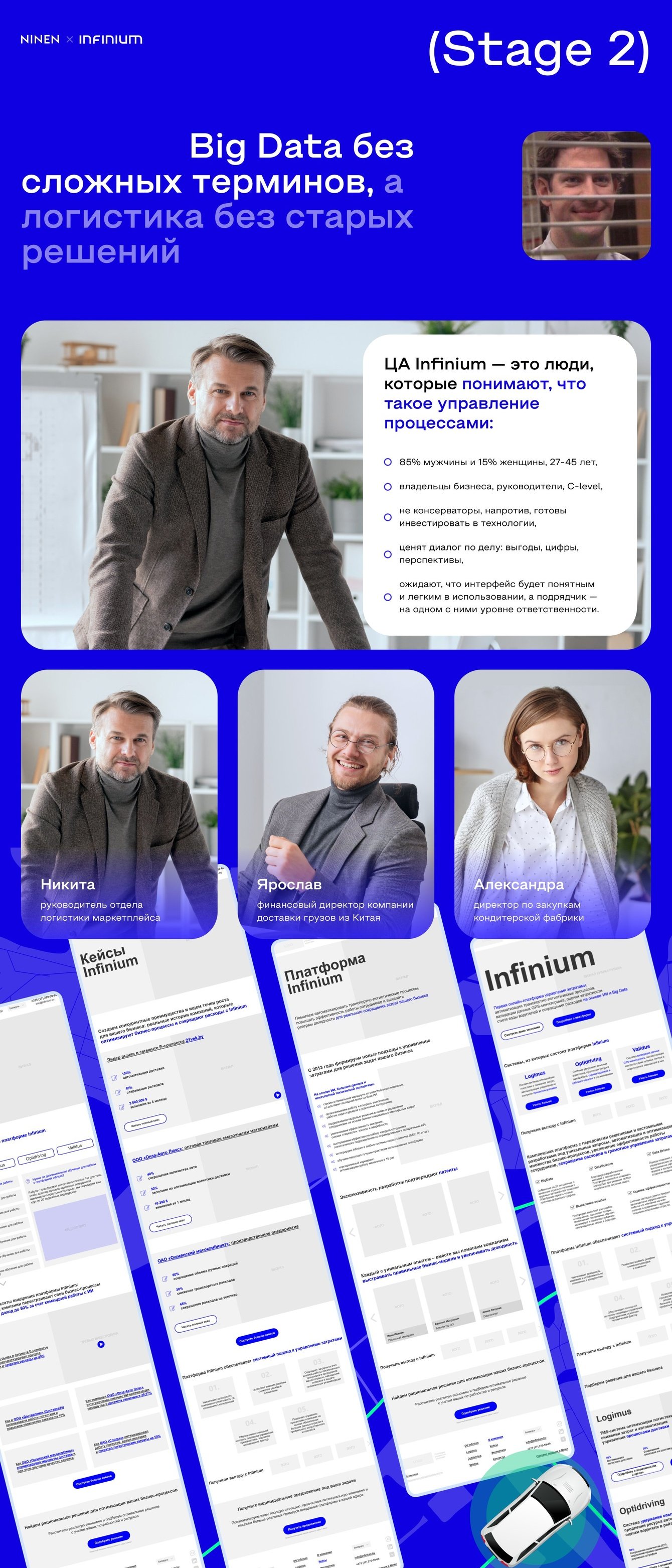 Мы начали с глубокого исследования потребностей как самого клиента, так и его ЦА. Важно было понять, какие проблемы решает Infinium и как вывести это решение в плоскость, понятную бизнесу. Мы анализировали текущие тенденции на рынке логистики, исследовали, как представлены аналогичные и даже смежные решения — 50+ сайтов логистических компаний — чтобы не пропустить ни одного пункта для отстройки. В итоге выработали стратегию, в которой технологии не просто «круто звучат», а решают реальные бизнес-задачи аудитории C-level. Результатом стали четкие тезисы для каждого раздела сайта, с учетом потребностей разных сегментов.