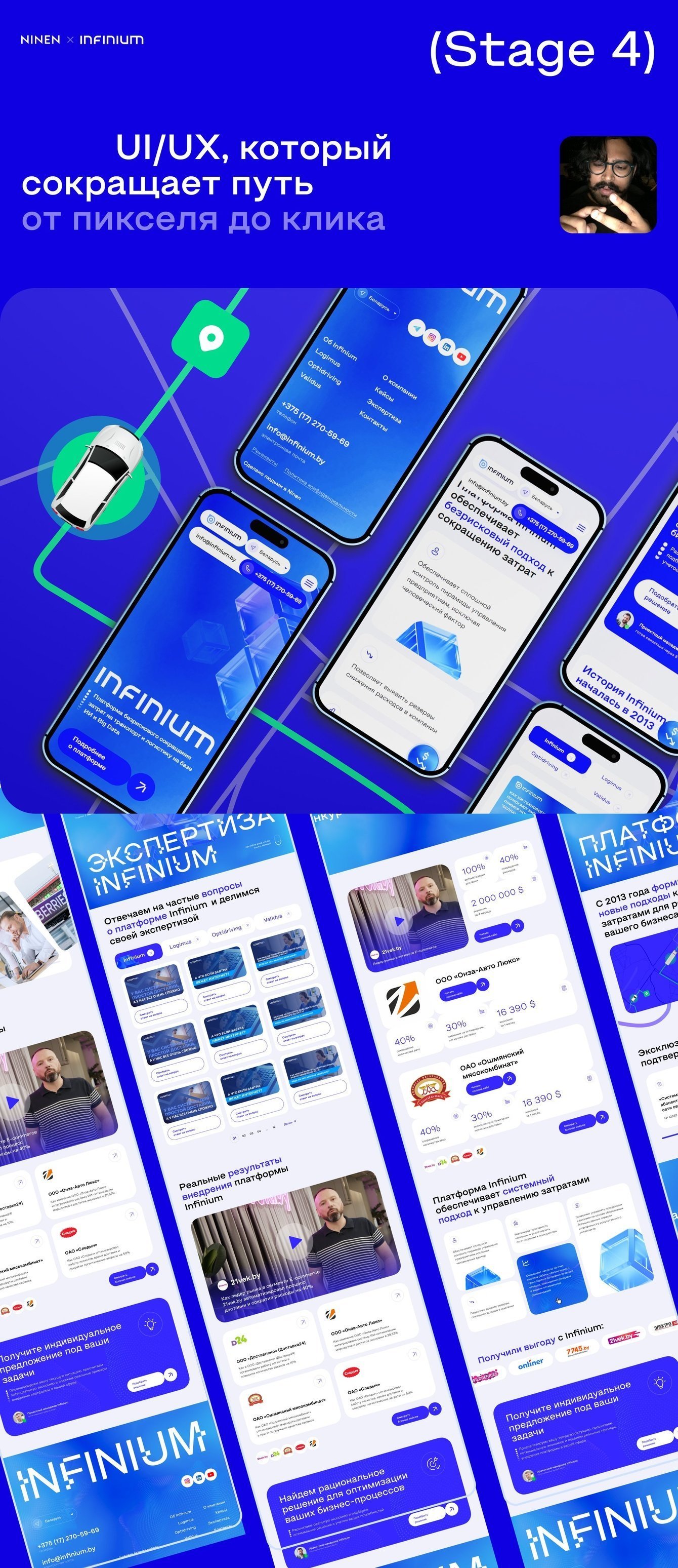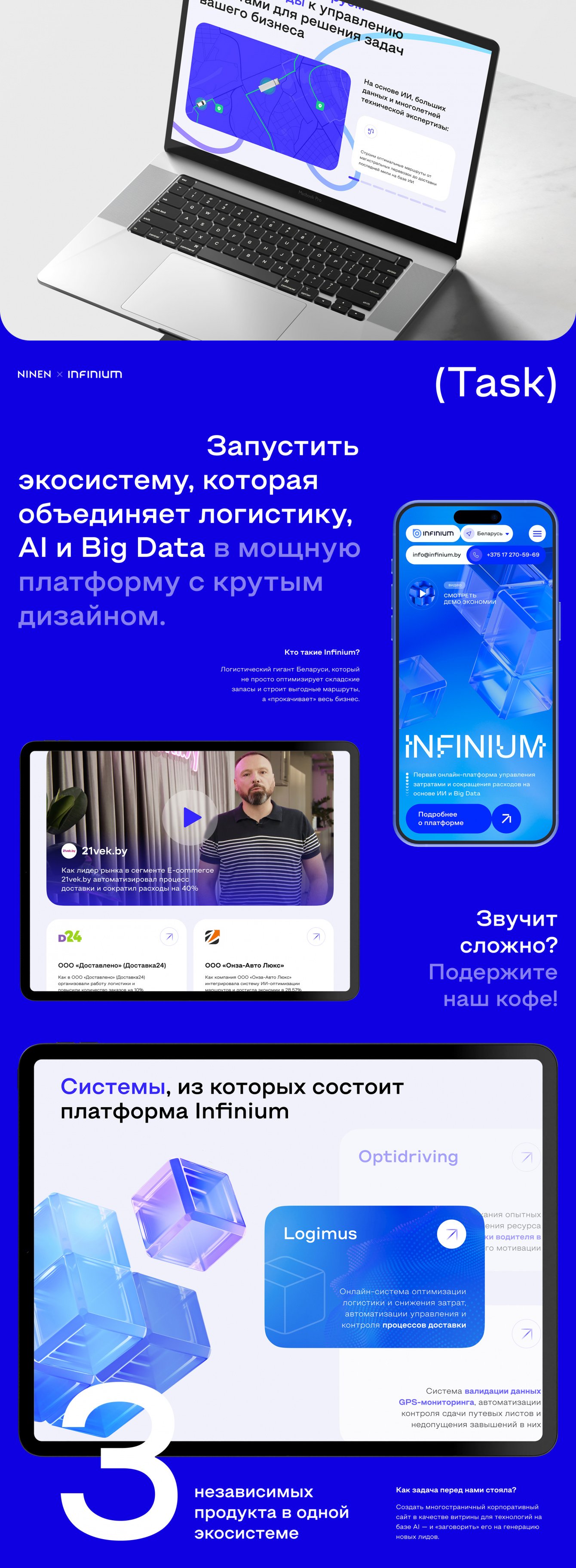 За 5 лет мы прокладывали максимально точные маршруты к результату и запускали серию сайтов для продуктов клиента — каждый из них был концентратом креатива, но при этом четко бил в бизнес-цели. На этот раз запрос был особенно амбициозным — запустить экосистему, которая объединяет логистику, AI и Big Data в мощную платформу с крутыми фичами и крышесносным дизайном для настоящих growth-hackers в РБ. Ведь Infinium — это логистический гигант, который не просто оптимизирует складские запасы и строит выгодные маршруты, а «прокачивает» весь бизнес.