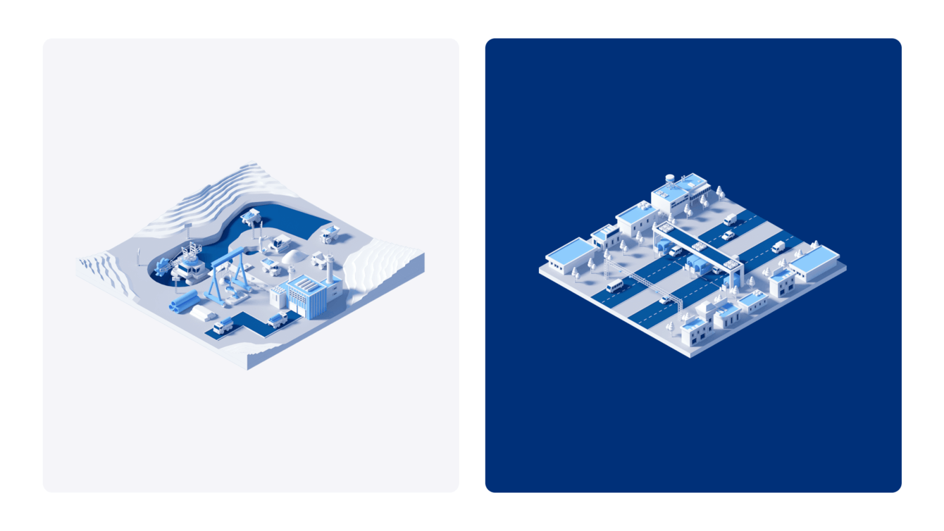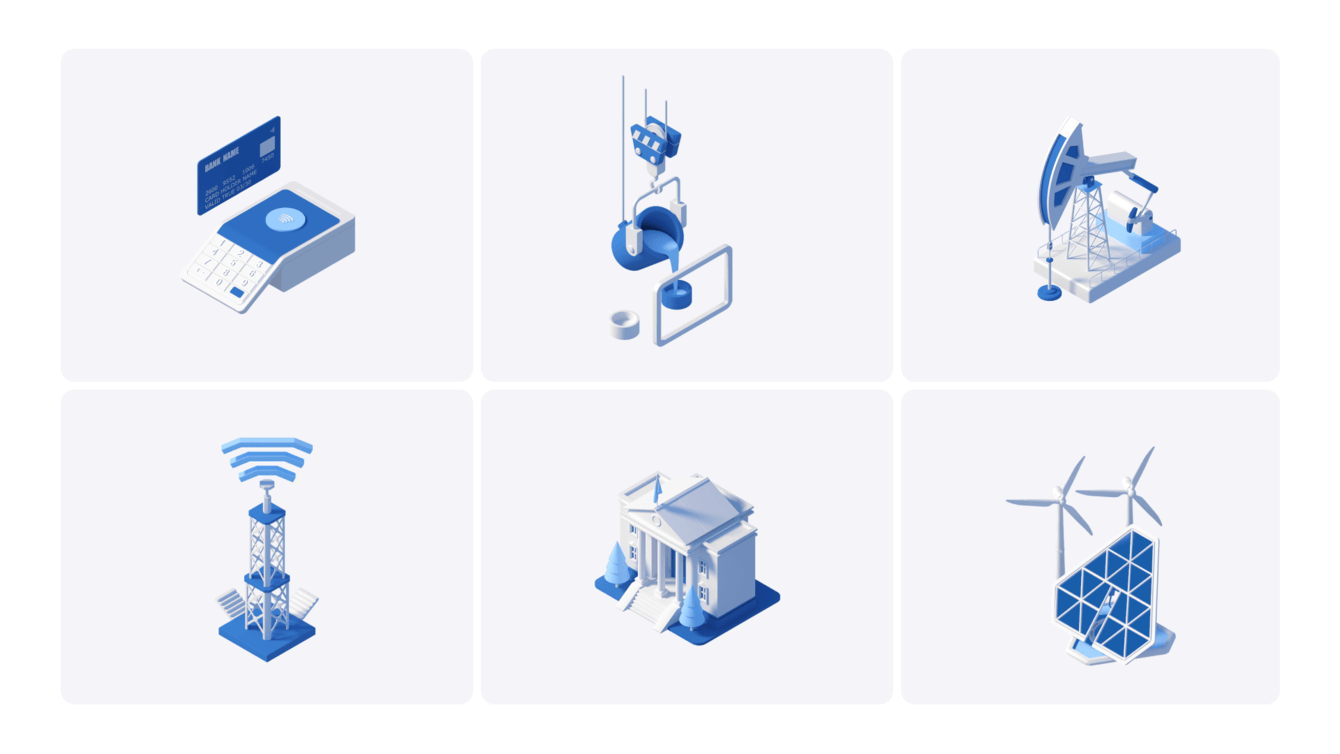 В процессе разработки визуалов на сайт мы поняли, что требуется визуализировать и отрасли, в которые интегрируются продукты заказчика, так как фактические кейсы публиковать на сайте нельзя.