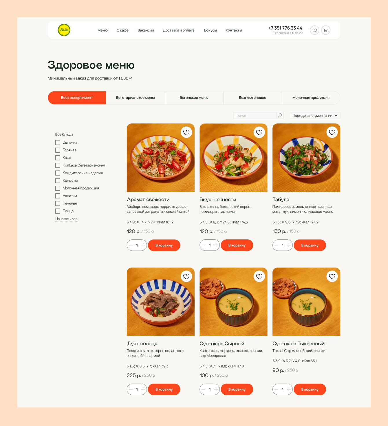 Обновить цветовую палитру и подобрать читаемые шрифты. Создать удобный каталог блюд с фильтрацией по категориям (вегетарианские, веганские, безглютеновые, с молочной продукцией).