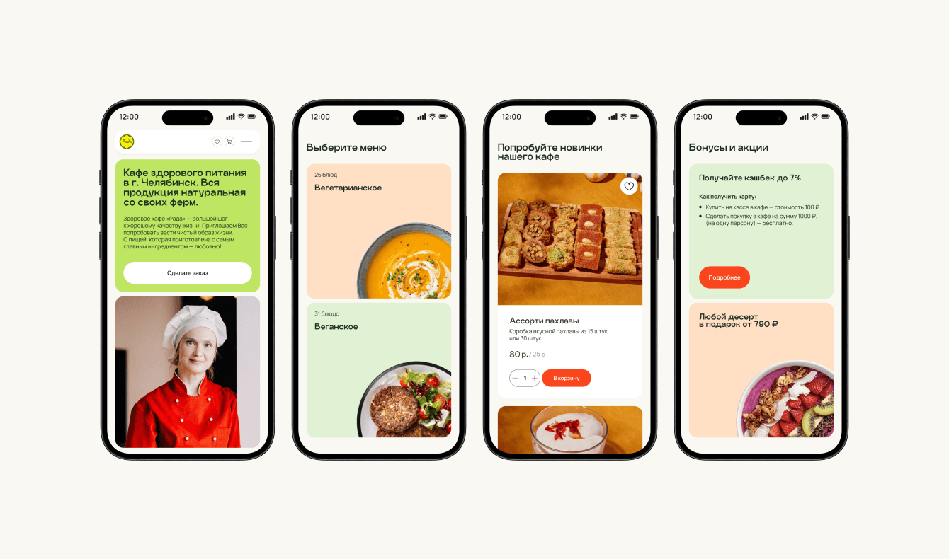 Мы начали редизайн сайта кафе здорового питания «Рада» с анализа целевой аудитории. Изучив предпочтения, запросы и поведение клиентов, мы выявили, что пользователи ценят удобство навигации, возможность фильтровать блюда по категориям и приятный визуальный стиль. Кроме того, мы проработали структуру сайта: пересмотрели страницы, перераспределили информацию и разложили всё по удобным разделам, чтобы пользователи могли легко находить нужную информацию и ориентироваться на сайте.