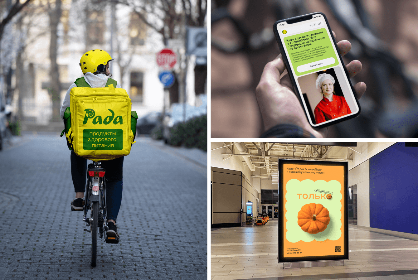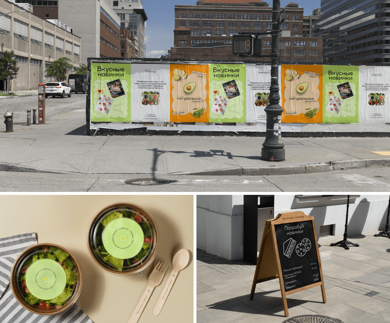 В рамках обновления бренда мы разработали новые элементы визуальной идентичности. Создали стильные вывески с обновлённым логотипом, которые гармонично вписываются в концепцию кафе. Упаковка для блюд была сделана удобной и экологичной, поддерживая стиль бренда. Также мы разработали билборды, которые привлекают внимание, подчеркивая свежесть и уникальность предложений кафе. Все эти элементы способствуют созданию целостного и узнаваемого образа бренда.