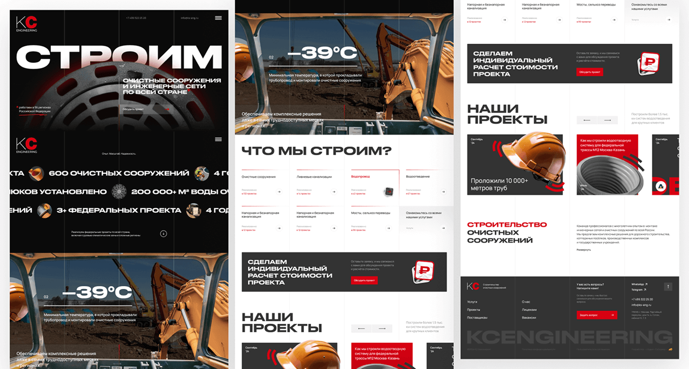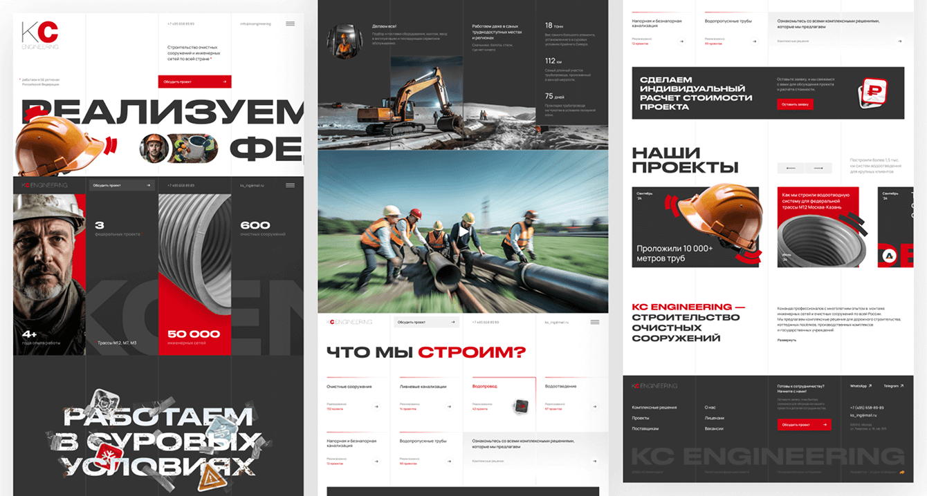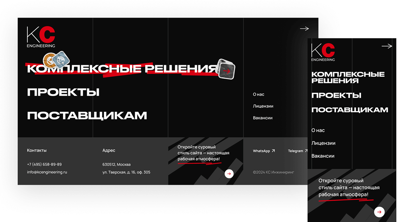 Запустили сайт KC Engineering в короткие сроки и сделали его по-настоящему запоминающимся: с ярким дизайном, эффектными анимациями и уникальной «суровой версией» для отрасли. Нам удалось совместить строгую подачу с дерзкими решениями, а кейсы и конструктор проектов сделали ресурс живым и удобным. Это тот случай, когда корпоративный сайт действительно выделяется и работает на имидж компании.
