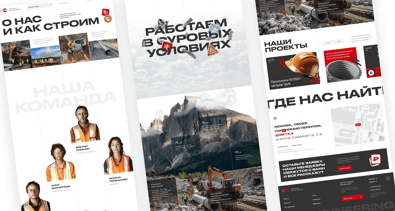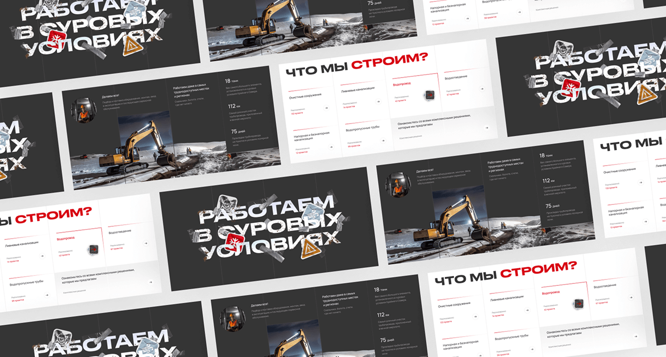 Что такое стройка? Это люди, которые которые носят спецодежду, работают в тяжелых условиях и не выбирают выражений :) Но что такое классический корпоративный сайт для них? Вот — аккуратная информация о компании, вот — вежливая кнопка «Оставить заявку». А хочется, чтобы сайт четко отвечал на вопросы, а ещё — за свои слова. Поэтому альтернатива говорит с пользователем прямо, без реверансов. В основе тот же дизайн, но усиленный резкими красными линиями и текстами, которые звучат как на стройке: честно, грубо и по делу.