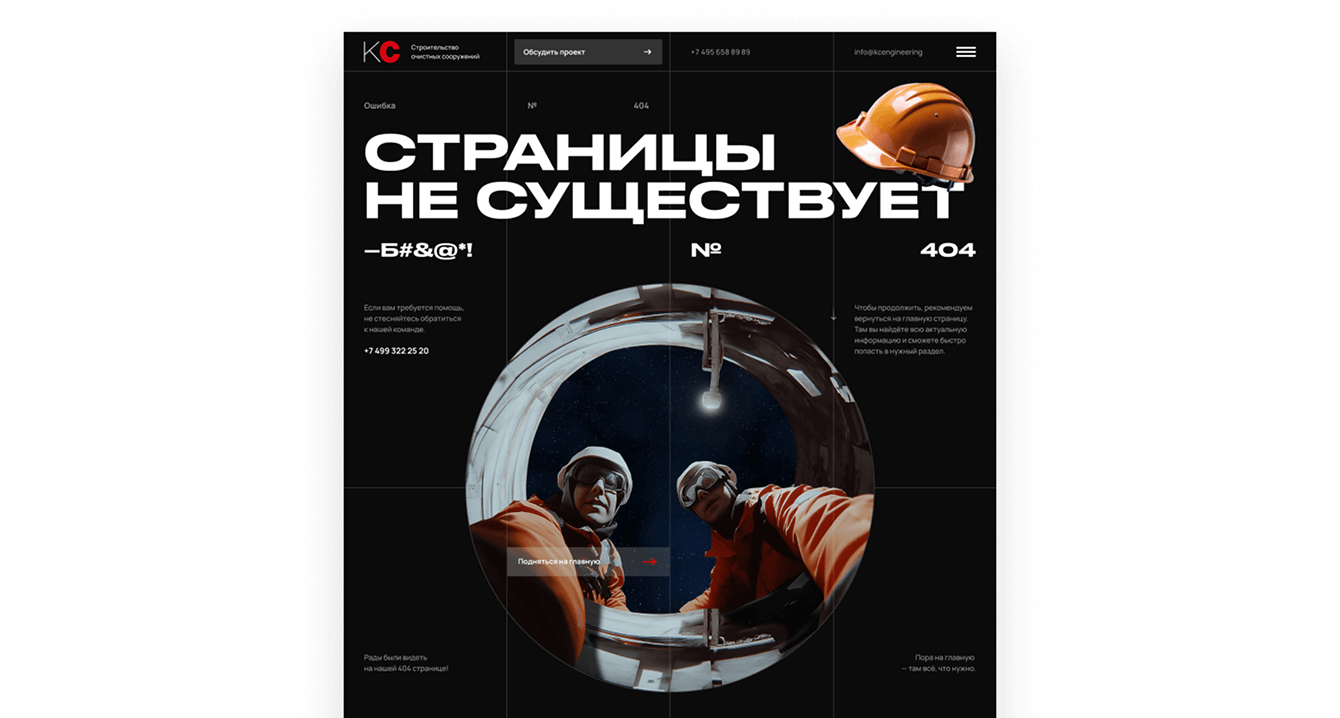 Отдельное удовольствие — страница 404. Мы сделали её максимально эффектной: контрастная типографика, рисованная сетка, тёмный фон и неожиданный ракурс «из канализационного люка». Даже ошибка выглядит стильно и запоминается.