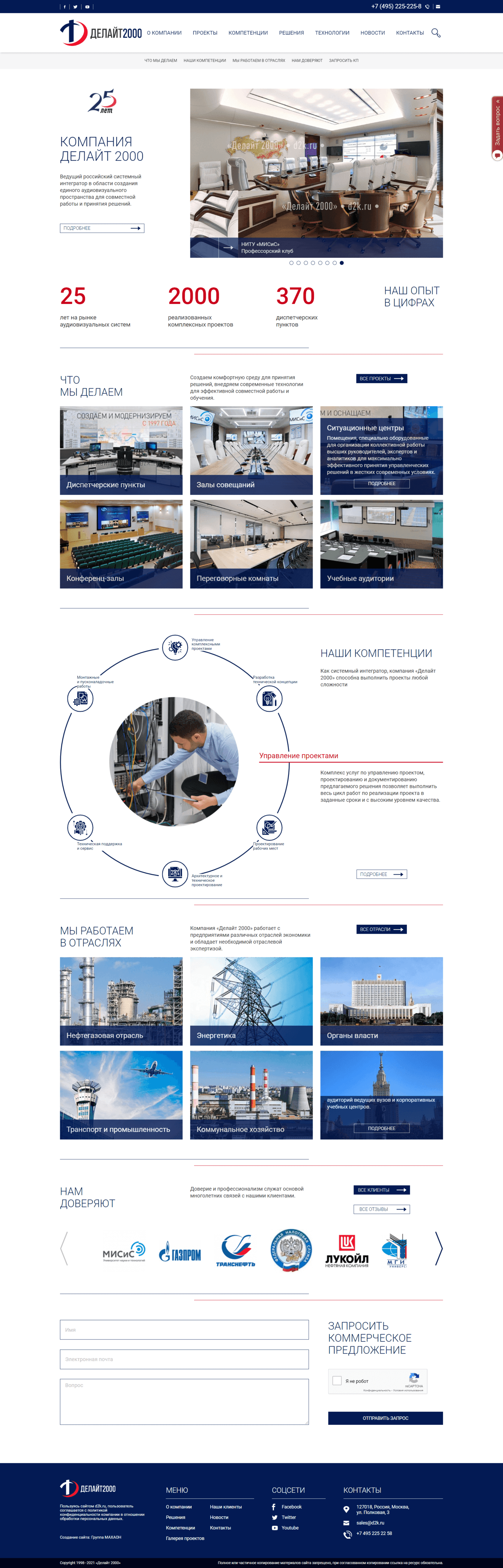 Делайт 2000 - старейший российский системный интегратор, специализирующийся на создании аудиовизуальной инфраструктуры для современных офисов, центров управления и учебных заведений. Старый сайт 2012 года морально устарел и требовал обновления.