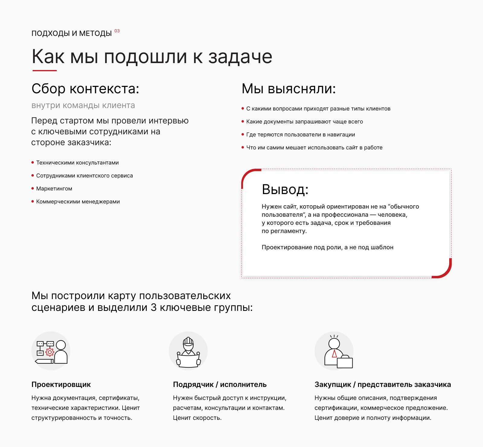 Вывод: нужен сайт, который ориентирован не на “обычного пользователя”, а на профессионала — человека, у которого есть задача, срок и требования по регламенту.