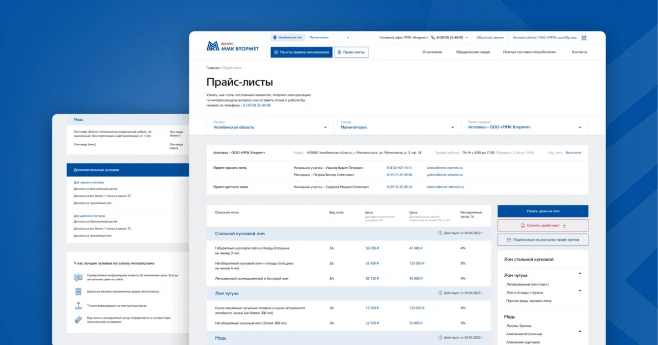 Сайт реализован в соответствии с техническим заданием и полностью отвечает поставленным целям и задачам. Клиенты компании «ММК Втормет» получают необходимую информацию о пунктах приема, ценах на лом с помощью удобного ресурса. Подобный подход, когда пользователю не надо тратить время, дозваниваться или ехать в конкретное место, чтобы уточнить детали, экономит время заказчика и компании. Также в перспективе сайт поможет привлечь новых клиентов и увеличить обороты.