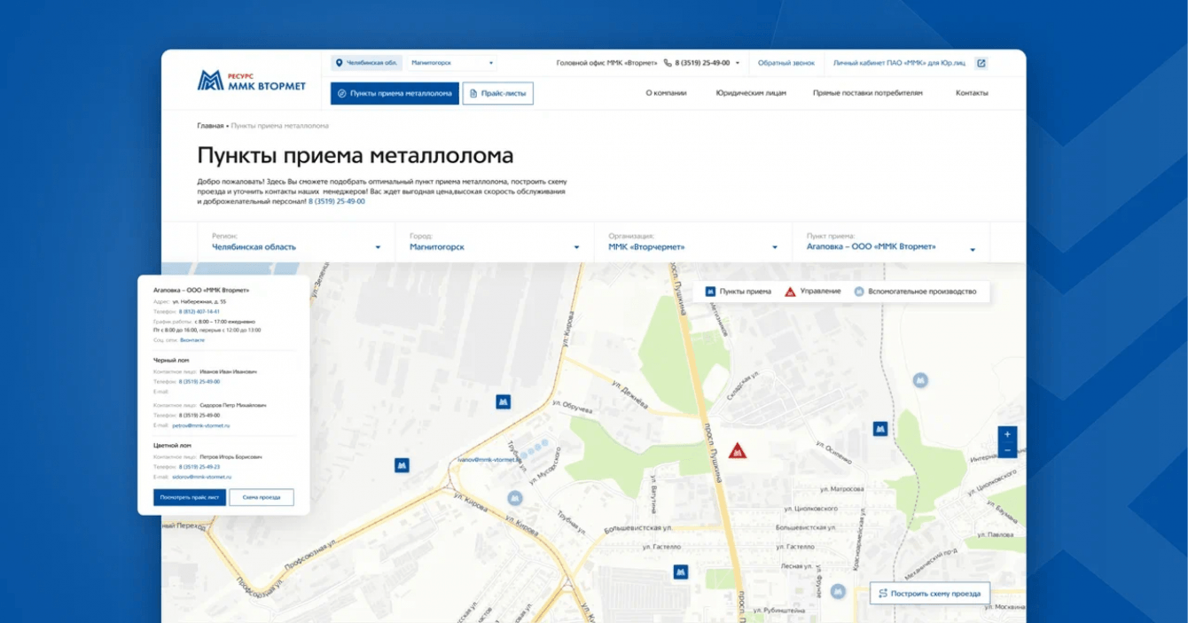 Один из самых популярных запросов — пункты приема металлолома. С главной страницы сайта пользователь может сразу перейти в соответствующий раздел и увидеть пункты на карте. Доступно также представление списком. Чтобы на карте отображались пункты для конкретного города, пользователю необходимо выбрать регион, город, также можно выбрать организацию и пункт приема. При переходе к конкретному пункту появляется окно с информацией (контакты, прайс-лист, схема проезда).