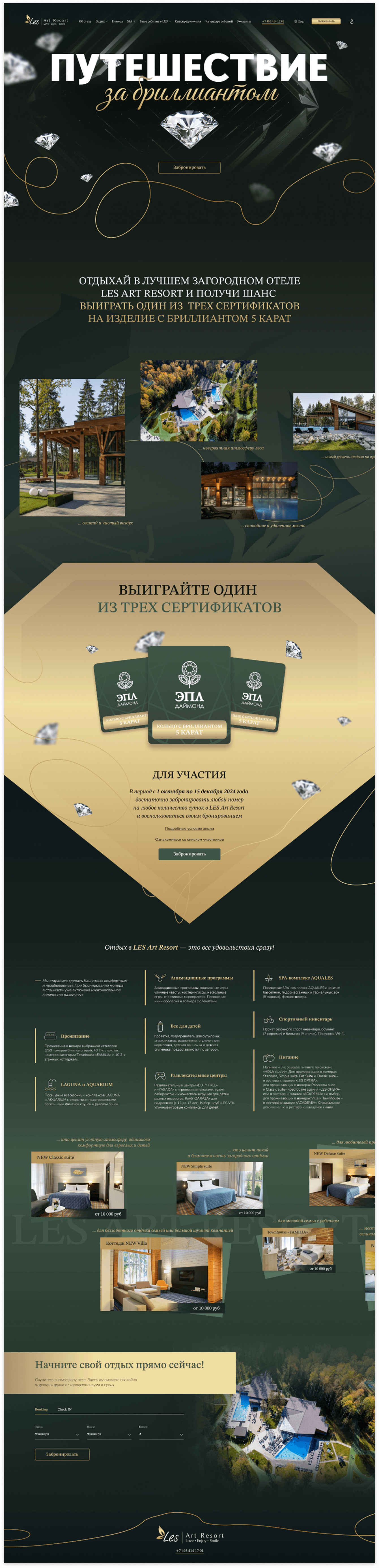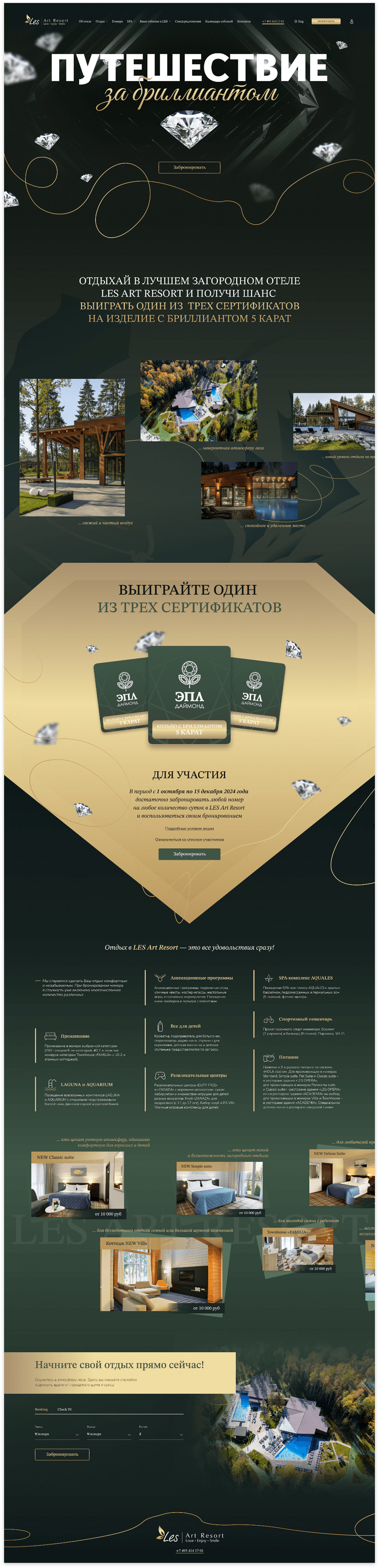 Совместно с ЭПЛ Даймонд компания Les Art Resort запустили конкурс на три сертификата на кольцо с бриллиантом в 5 карат. Мы запустили лендинг с конкурсом и добавили классные анимации, которые выводились на всех страницах сайта в течение всего розыгрыша. Постояльцы, которые приняли участие в конкурсе, были занесены в базу, из которой по окончанию розыгрыша были выбраны три победителя.