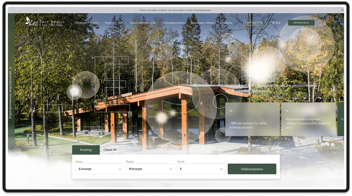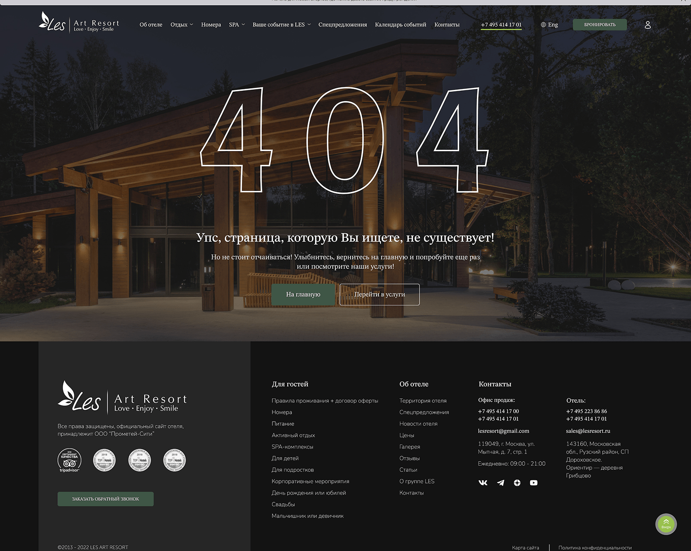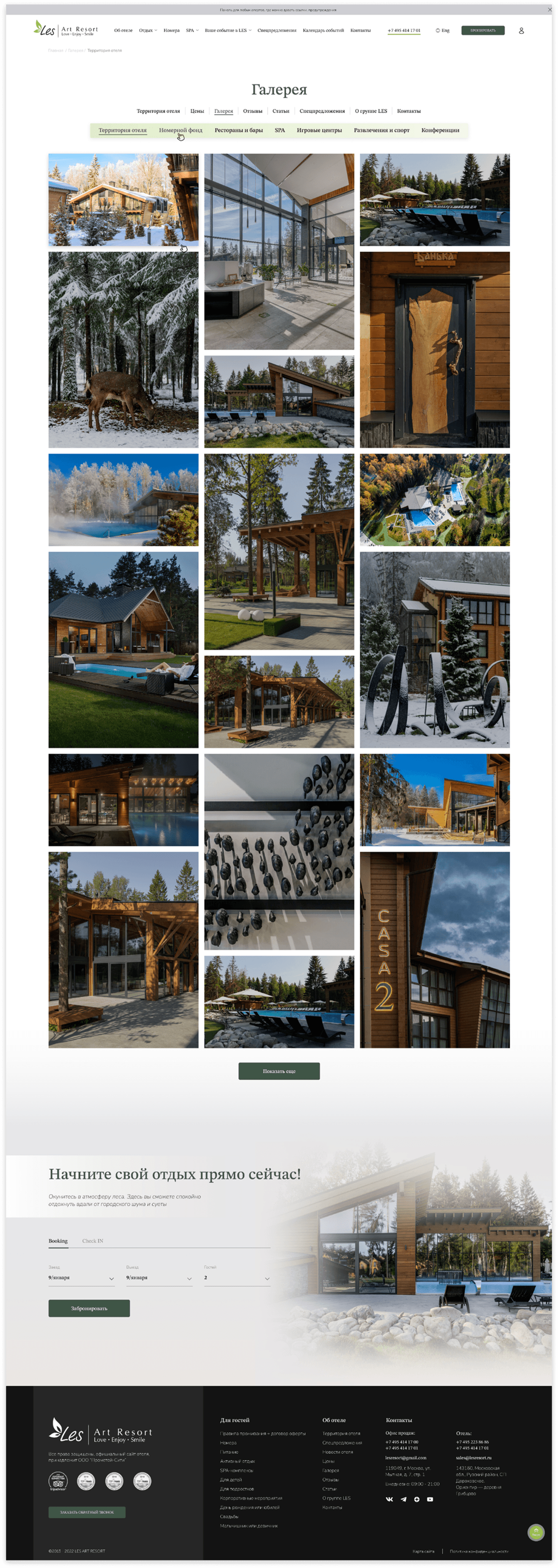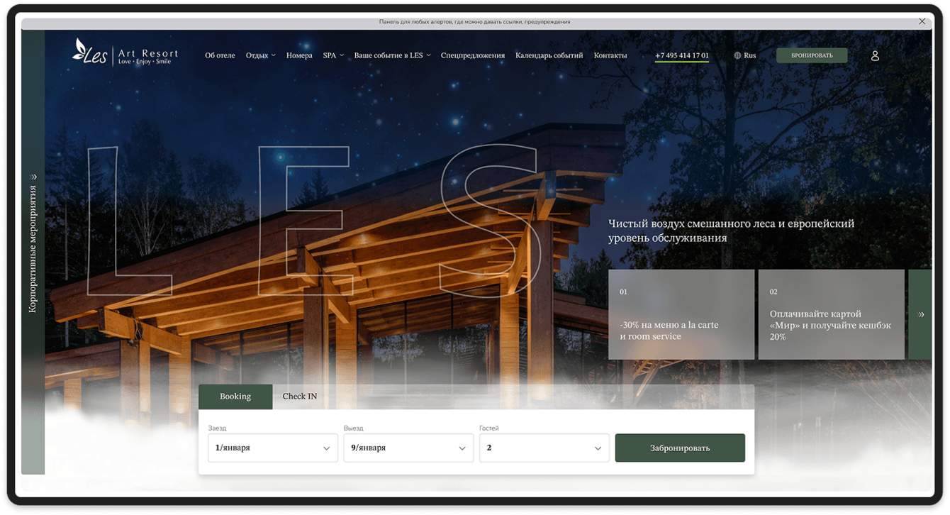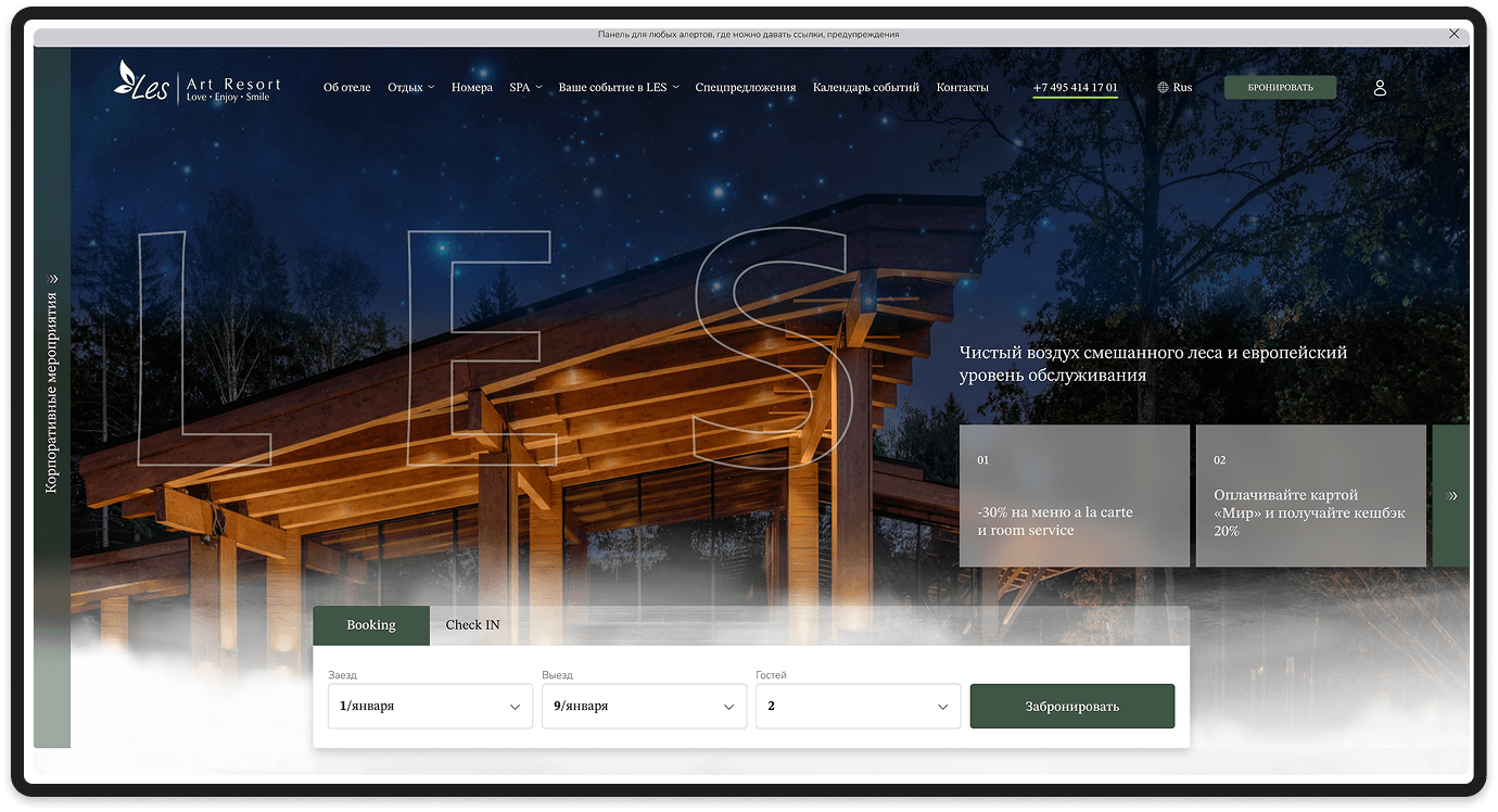 Мы начали сотрудничество с LES Art Resort в 2022 году. Команде отеля требовался редизайн действующего сайта, который перестал отвечать потребностям отдела продаж, не мог предоставить посетителям полного списка услуг, а также имел определенный набор программных ошибок.