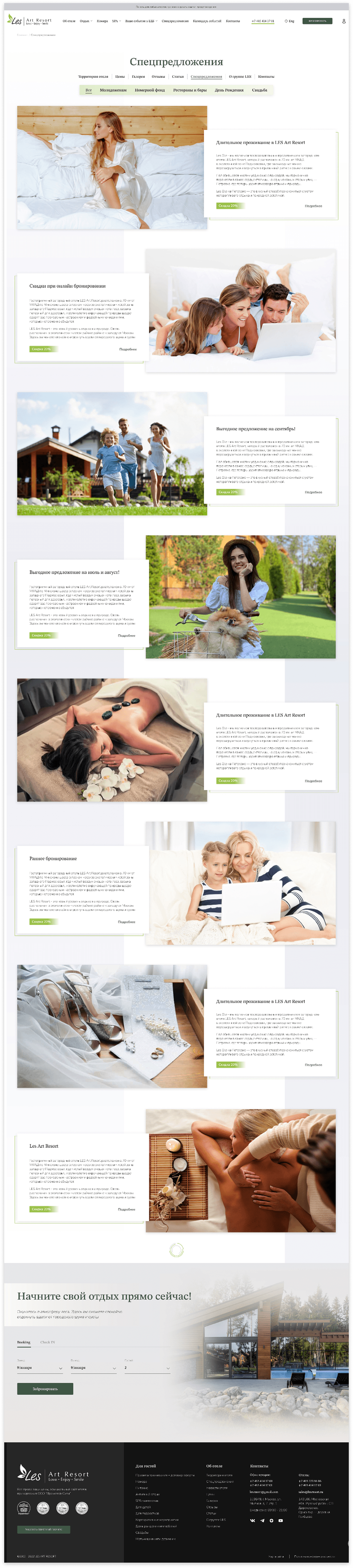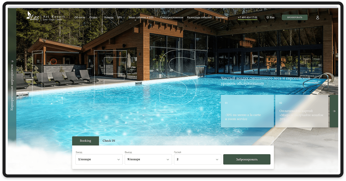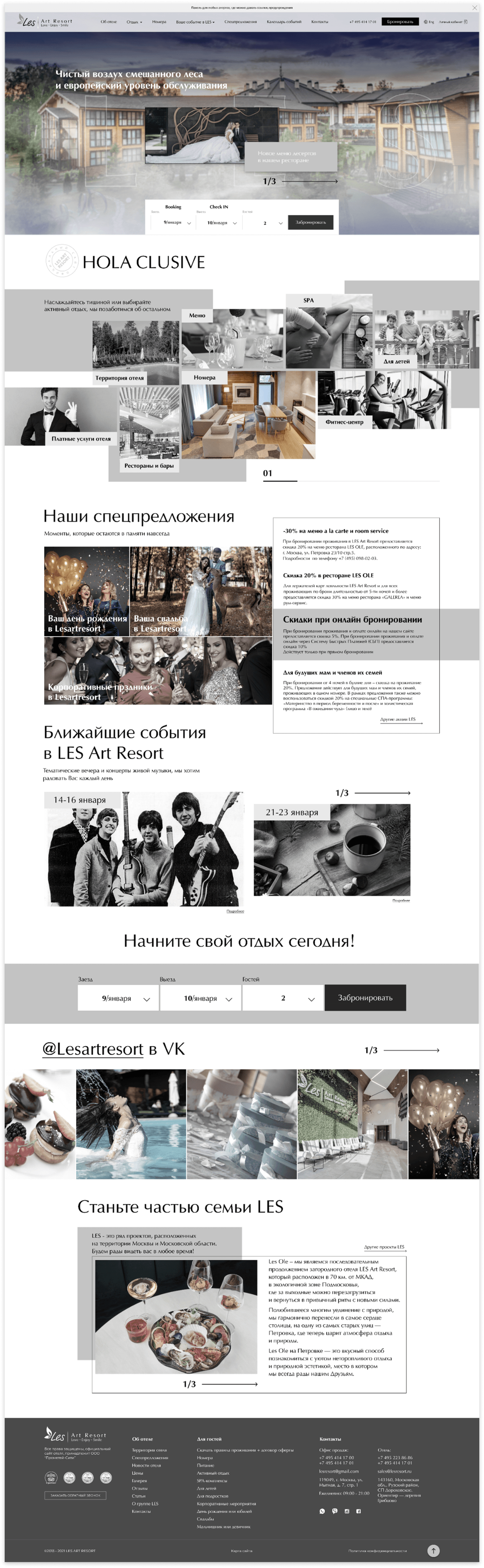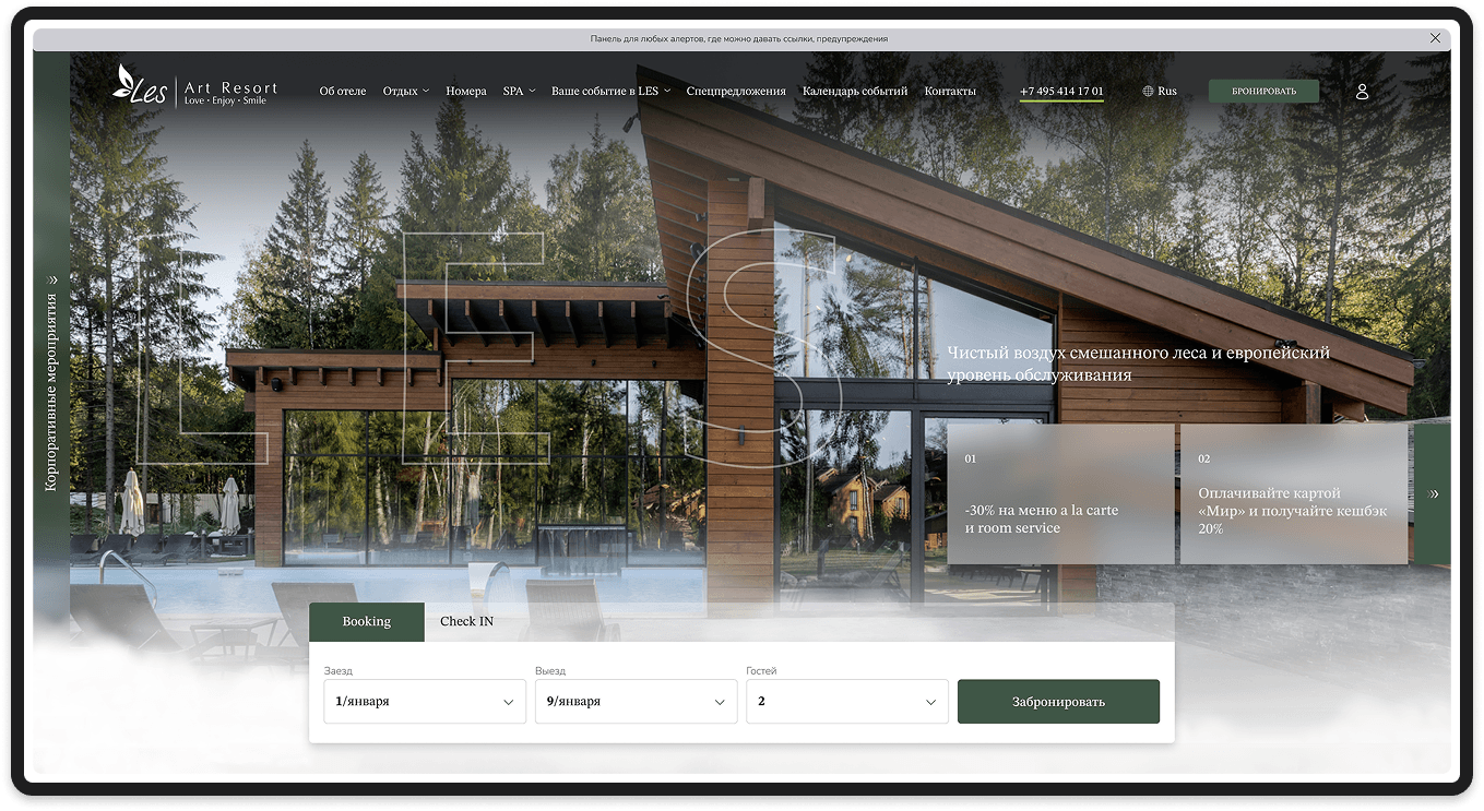 Мы начали сотрудничество с LES Art Resort в 2022 году. Команде отеля требовался редизайн действующего сайта, который перестал отвечать потребностям отдела продаж, не мог предоставить посетителям полного списка услуг, а также имел определенный набор программных ошибок.