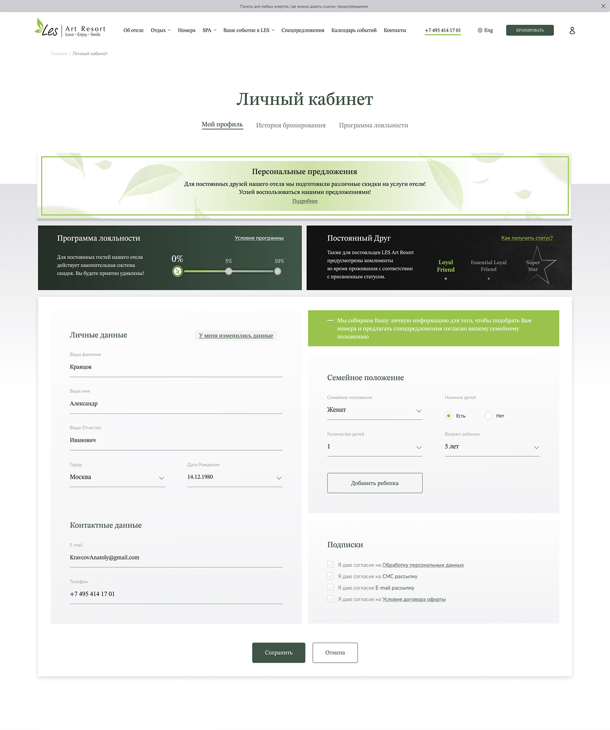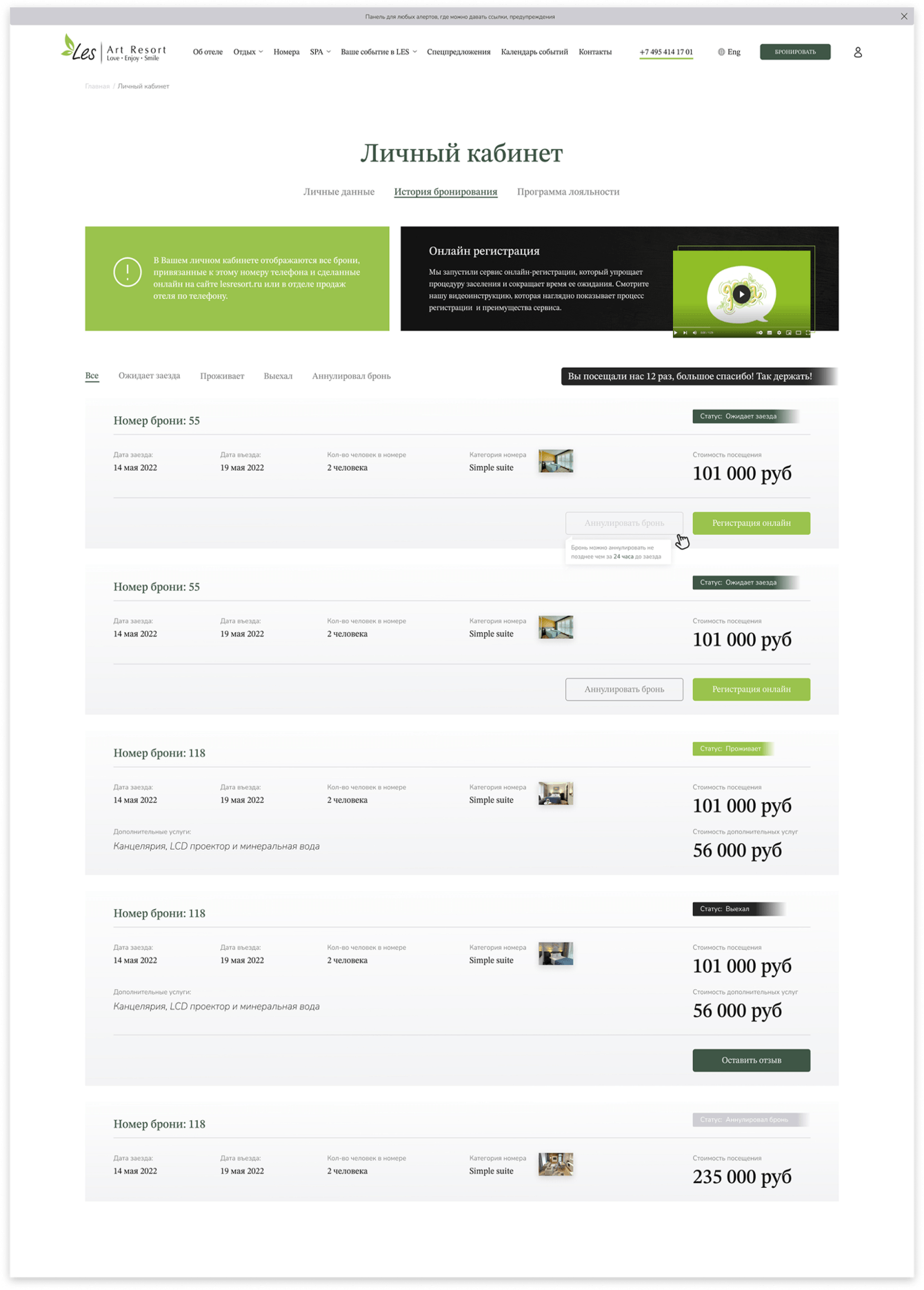 Личный кабинет: На сайте появился классный личный кабинет пользователя со всем современным набором возможностей. В личном кабинете реализована полная история бронирования и программы лояльности для пользователя. У пользователя в личном кабинете есть накопительная система скидок. Также для каждой брони есть свой статус. Он также может быть обновлен самим гостем, если он подтверждает или отменяет свое бронирование онлайн.