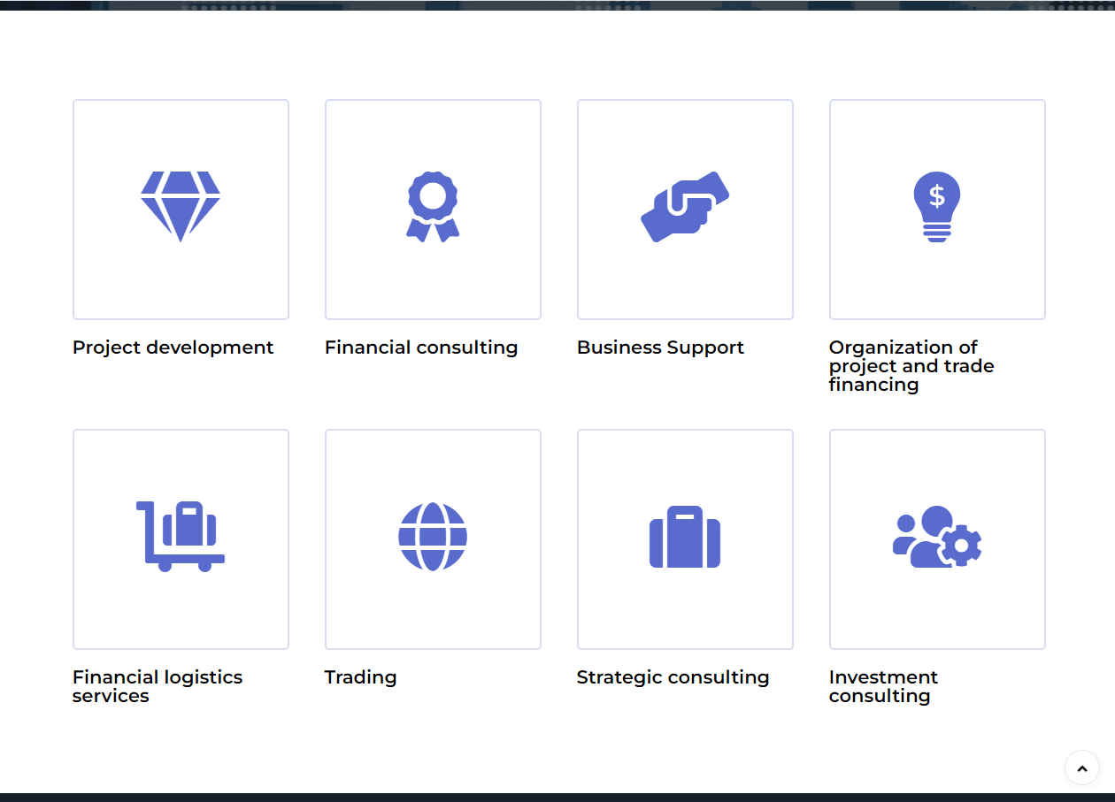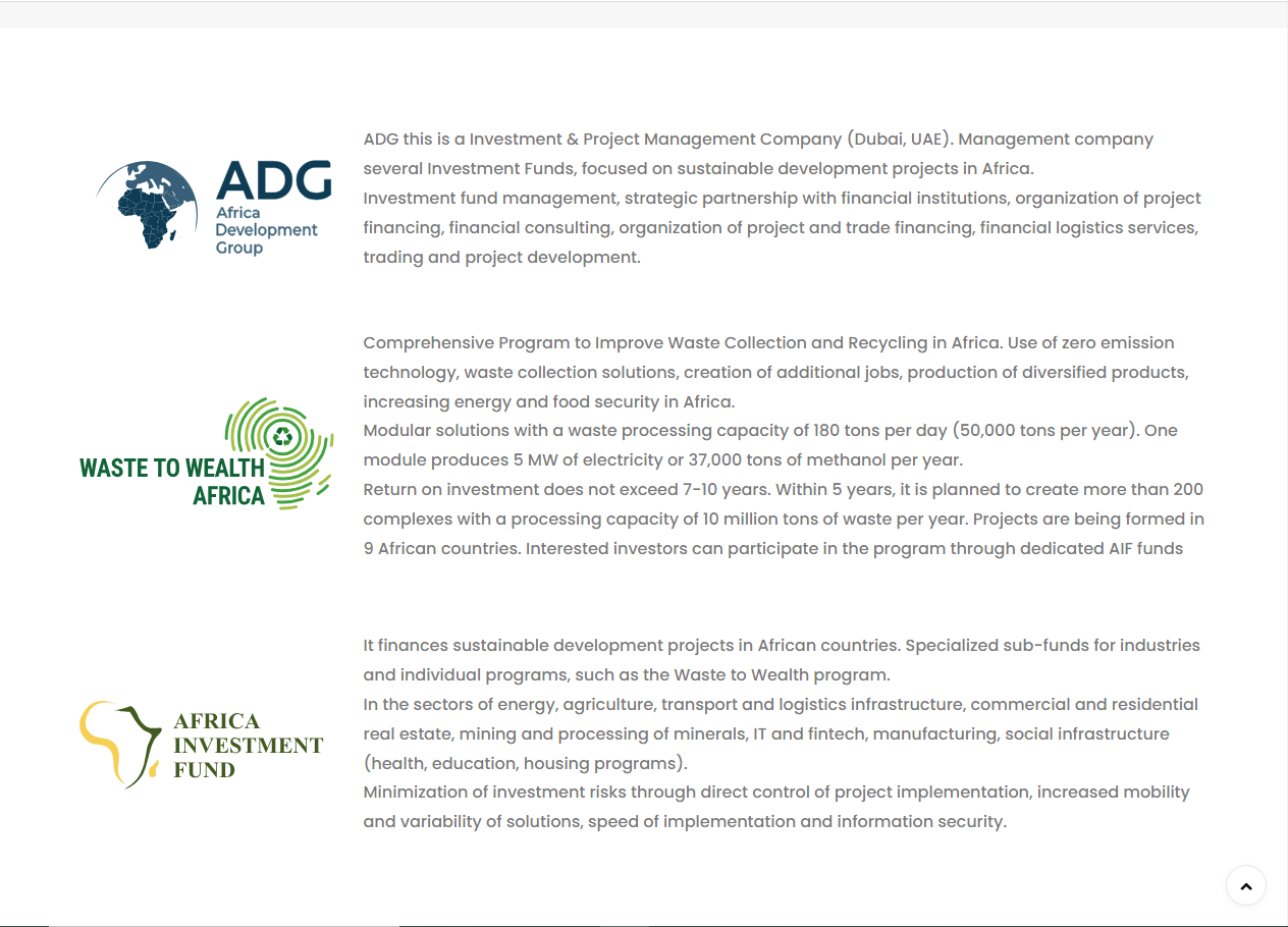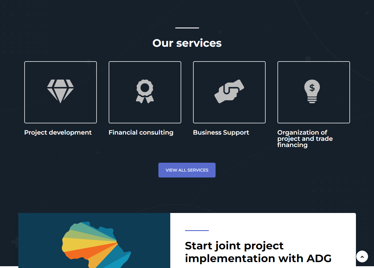 Создать простой и понятный корпоративный сайт для инвестиционного фонда в ОАЭ для стран Африки. Предоставить посетителям ознакомиться с услугами и проектами фонда, а также отправить заявку на дальнейшее сотрудничество.