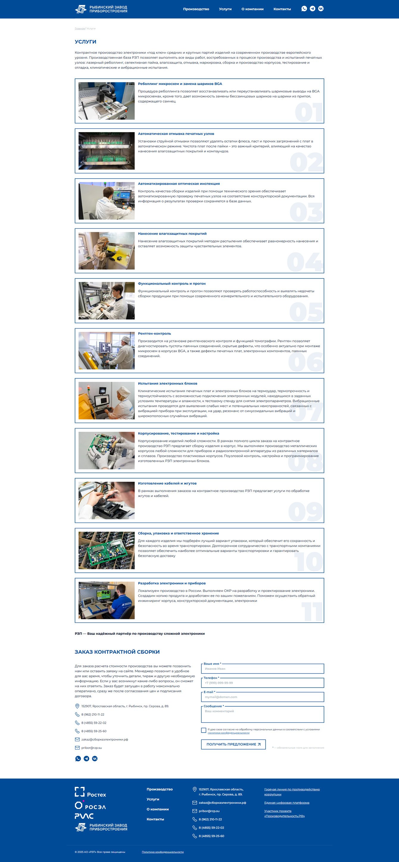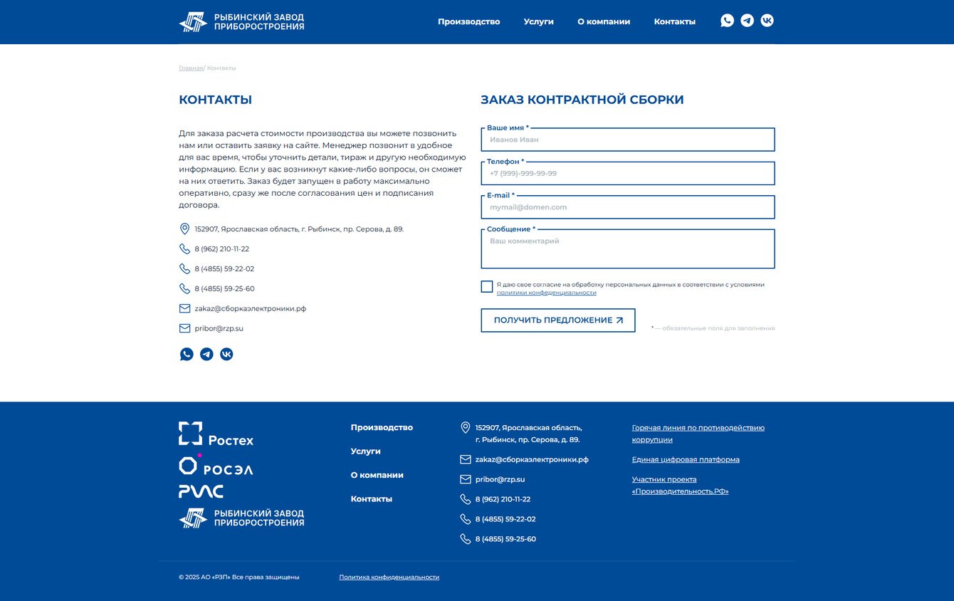 Разработать корпоративный сайт сборкаэлектроники.рф для Рыбинского приборостроительного завода с целью детализации услуг контрактного производства электроники, представленных на основном сайте rzp.su.
