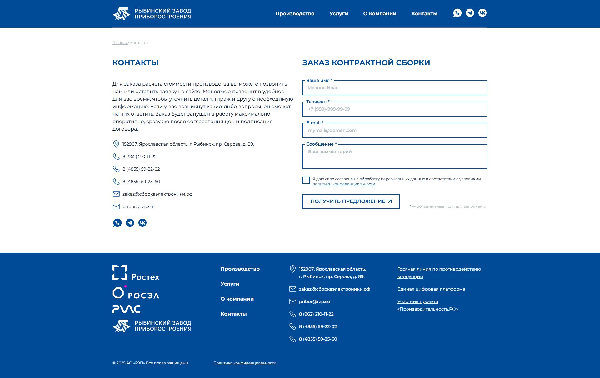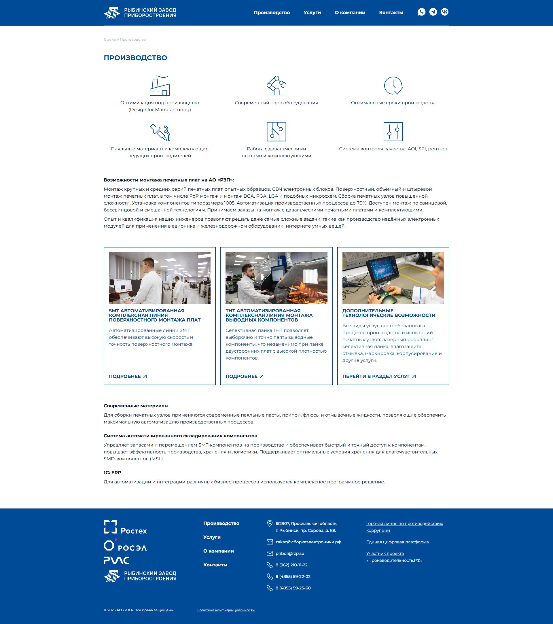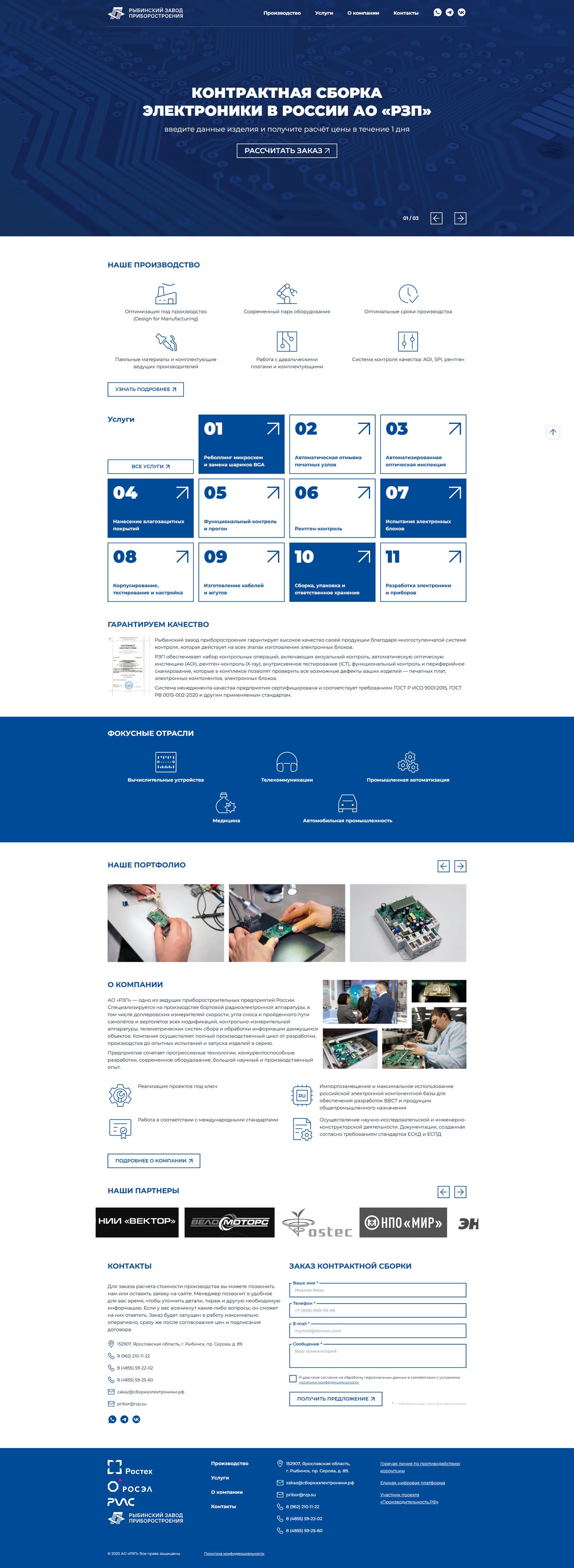 Разработать корпоративный сайт сборкаэлектроники.рф для Рыбинского приборостроительного завода с целью детализации услуг контрактного производства электроники, представленных на основном сайте rzp.su.