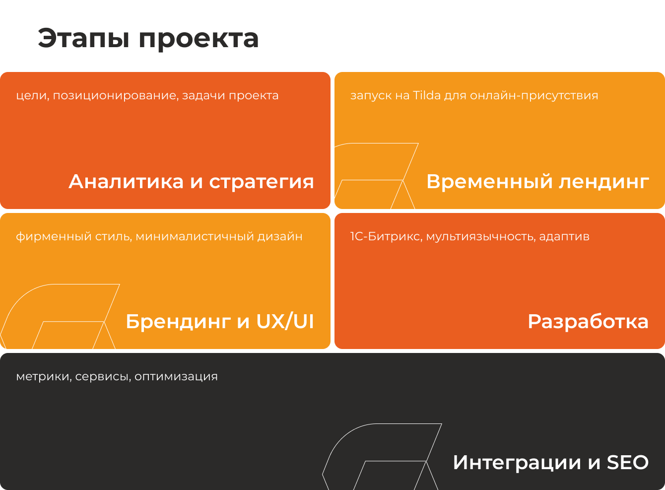 Корпоративный сайт заказчику требовался быстро, но его разработка занимает несколько месяцев. Чтобы не оставлять заказчика без полного присутствия в сети, мы создали временный лендинг на Tilda с базовой информацией о компании и контактами для обратной связи.