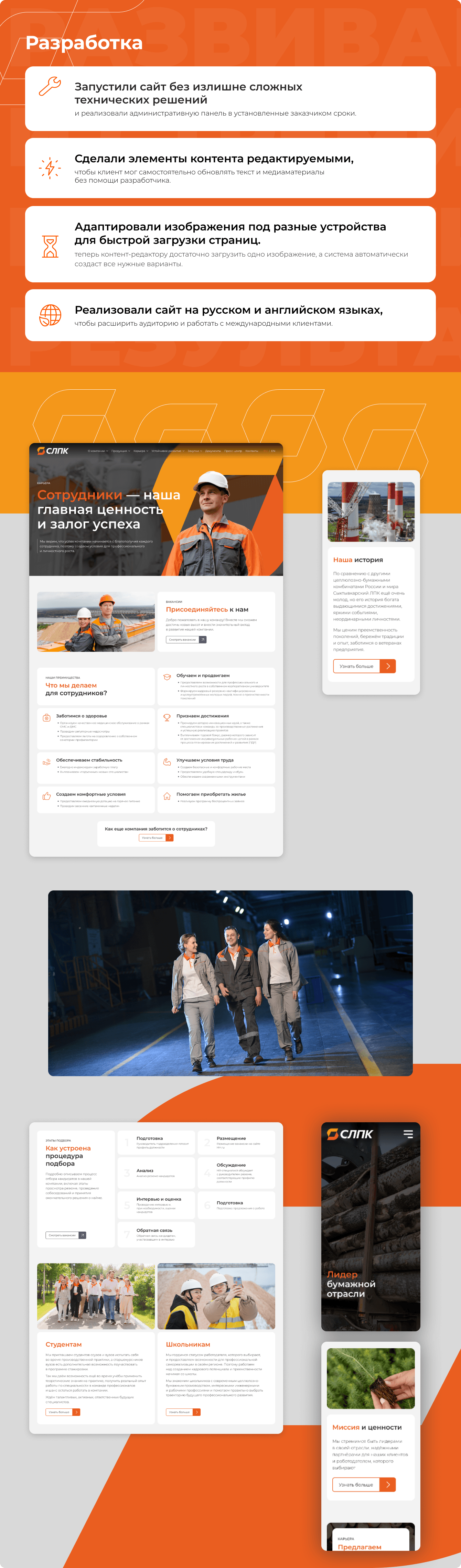 Команда «Иностудио» предложила решение «под ключ»: мы отвечали за дизайн, разработку, хостинг, администрирование и SEO. На время реализации мы создали временный сайт на Tilda с базовым функционалом, чтобы «СЛПК» оставался доступным для клиентов.
