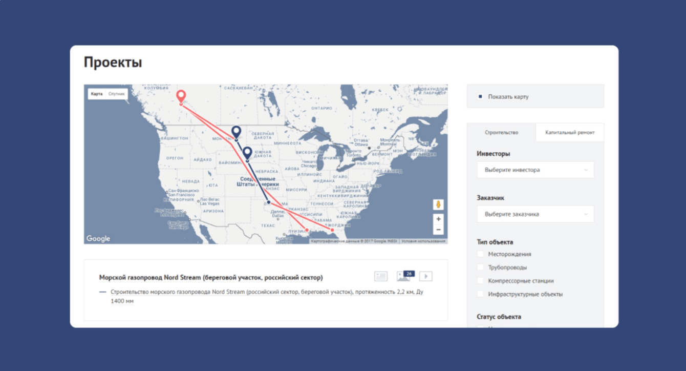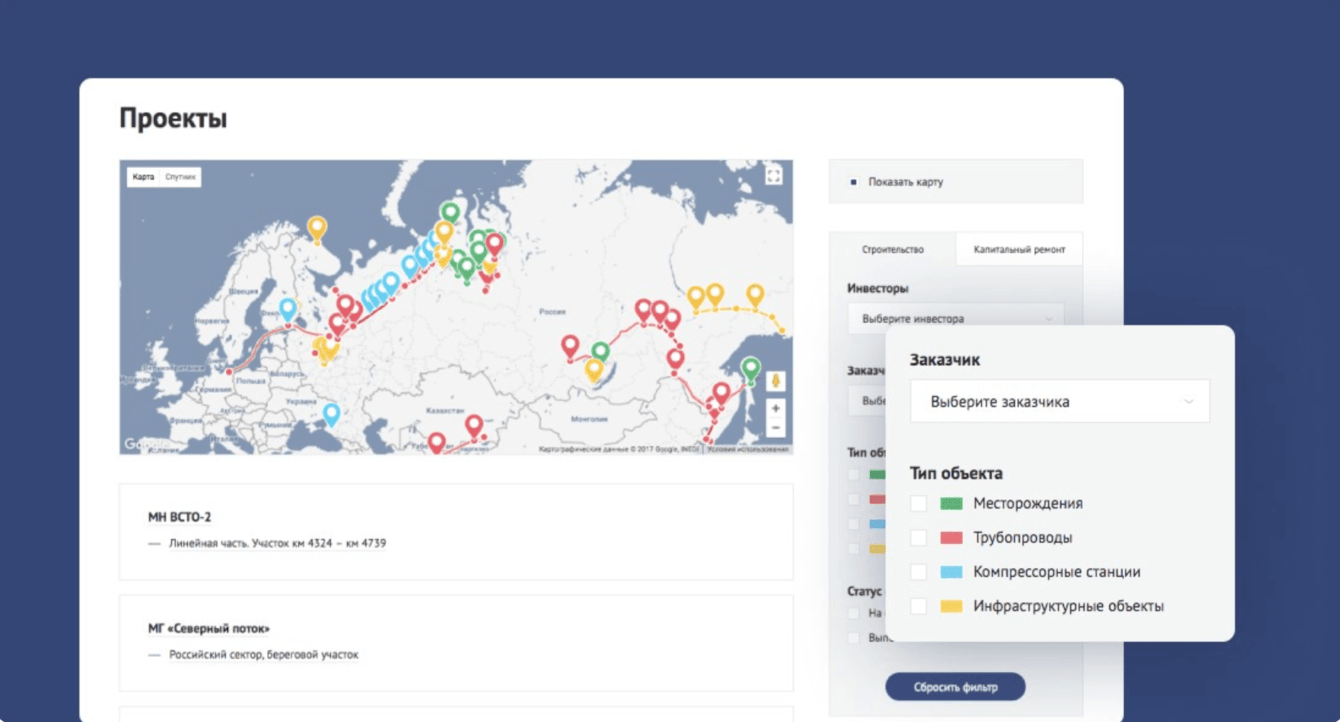 В слайдере на главной первыми вывели важную информацию о месторождениях и трубопроводах, не забыв про инфраструктурные объекты