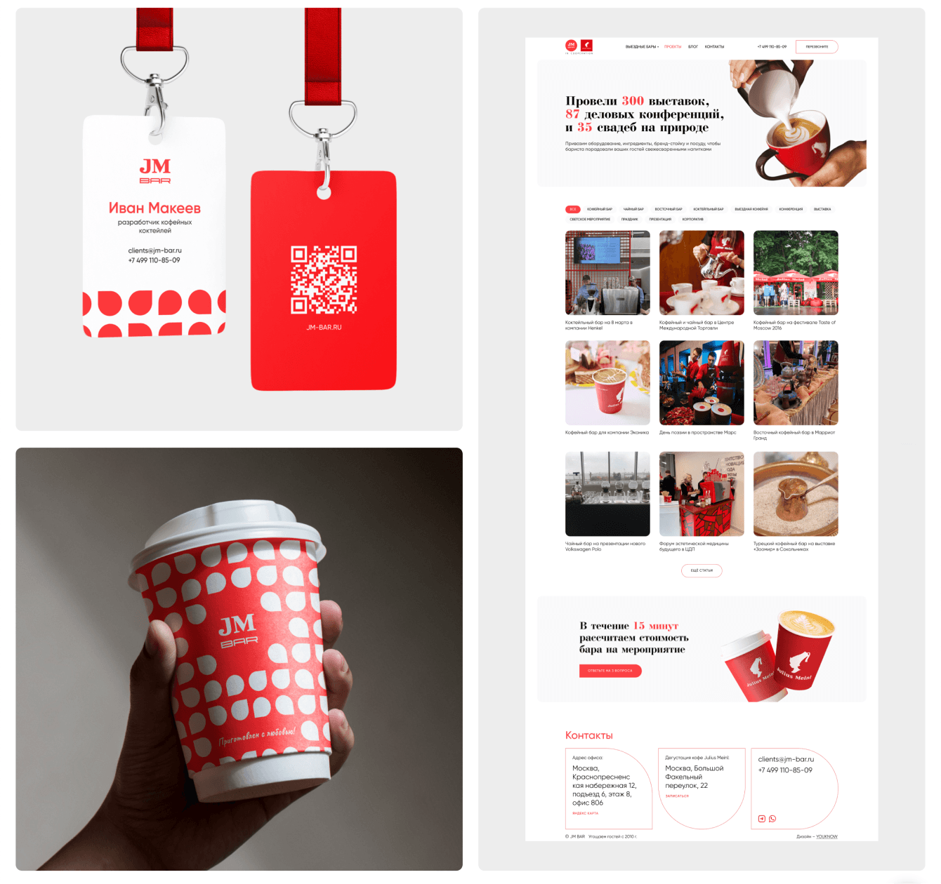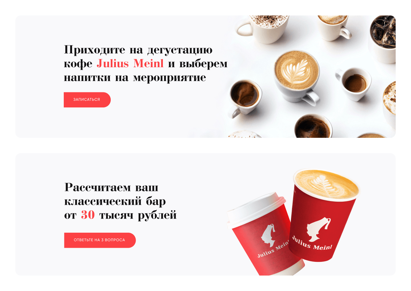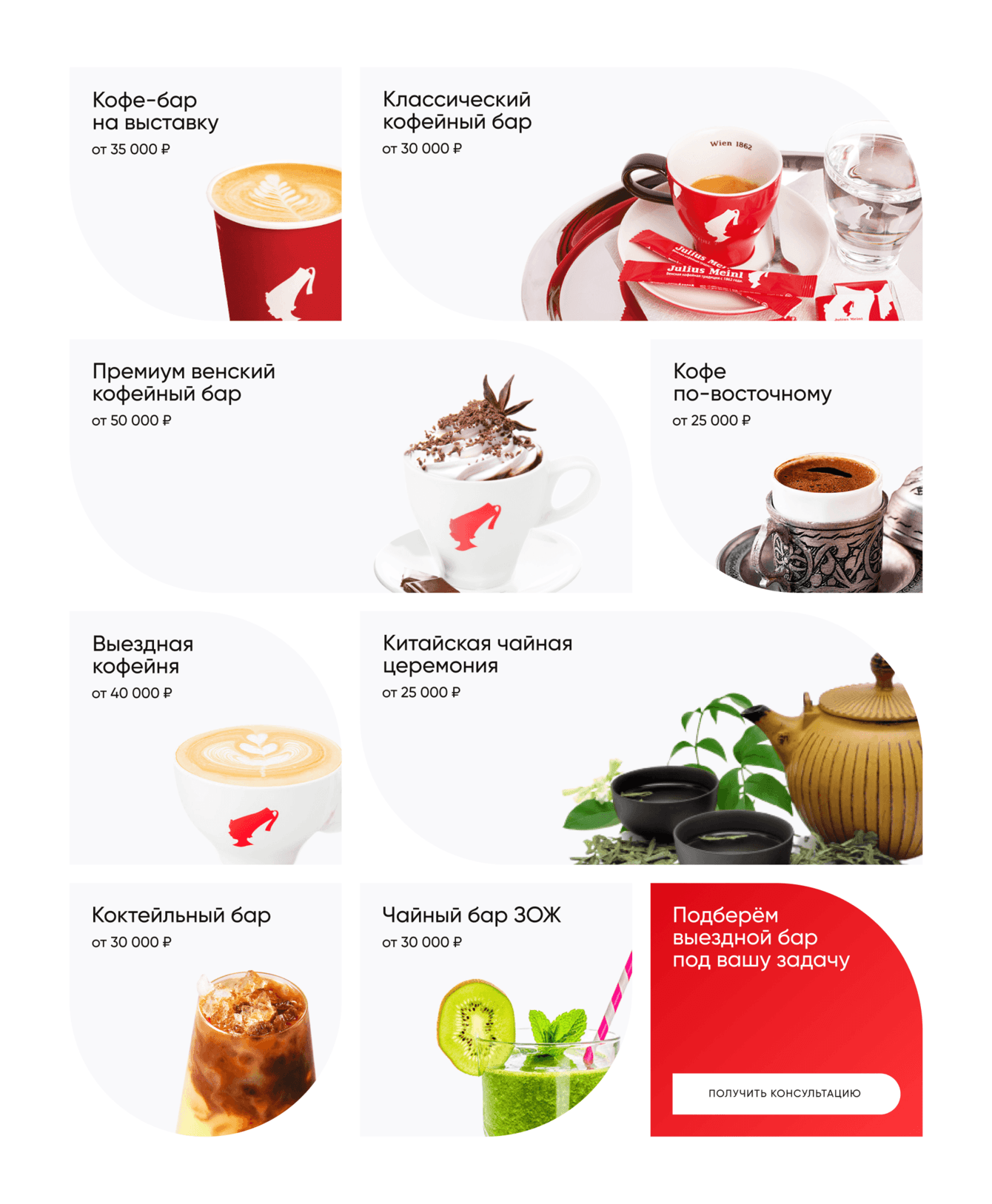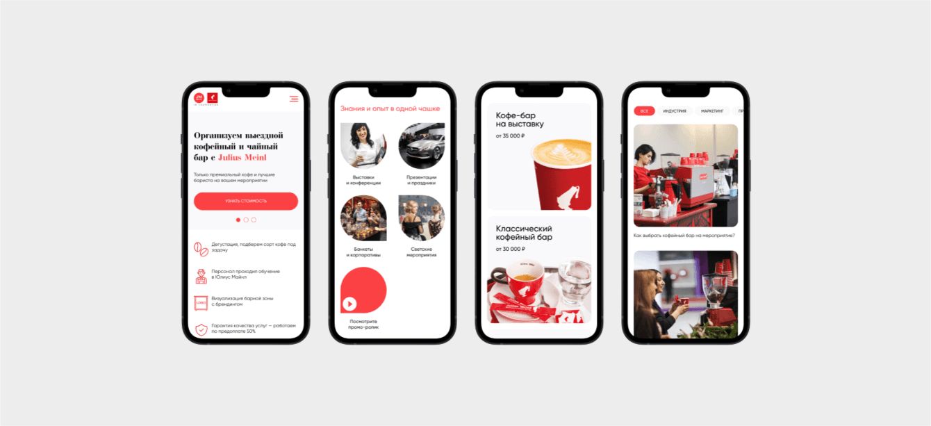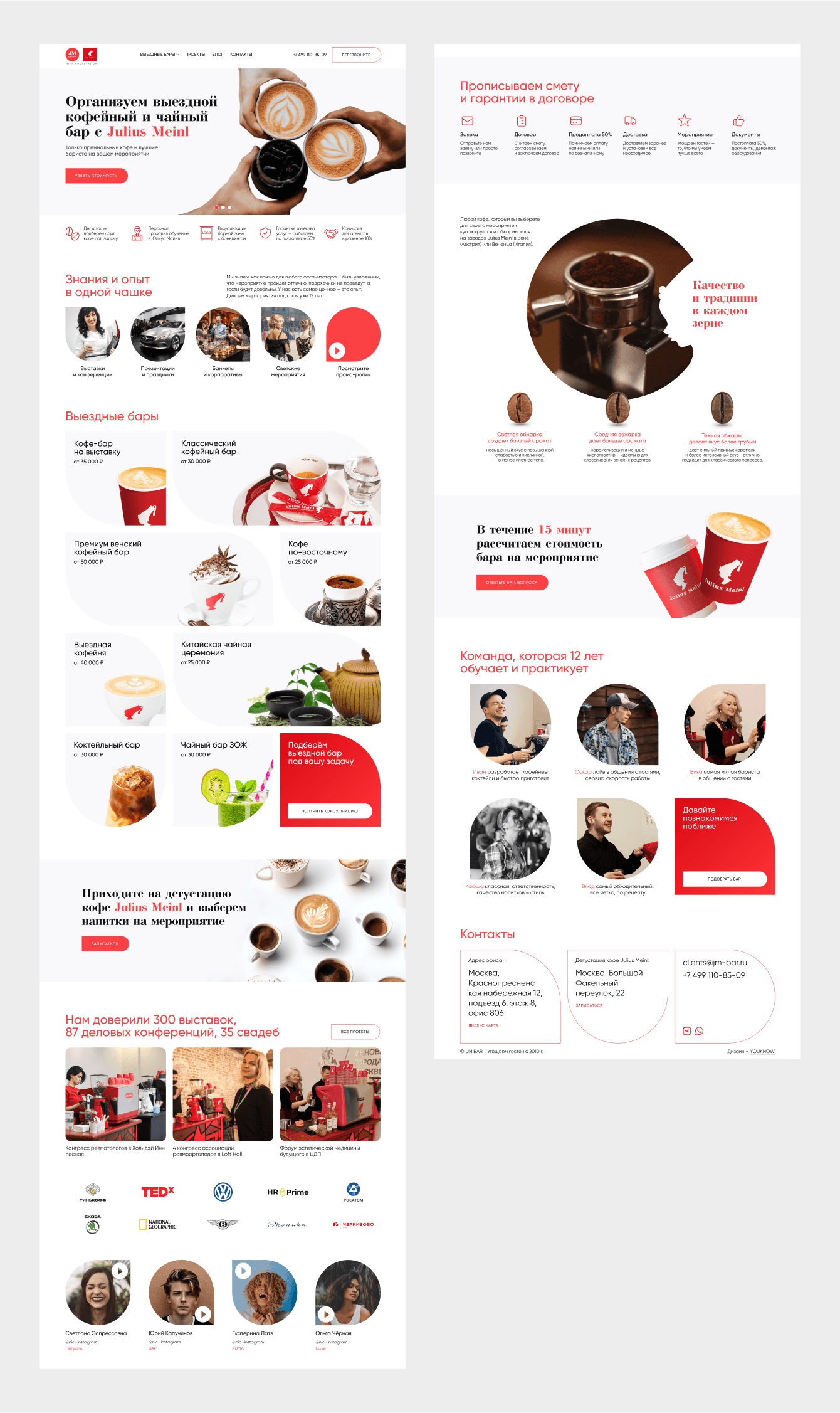 В ходе анализа мы узнали, что JM BAR коллаборируется с известым кофейным брендом Julius Meinl, который также имел на тот момент красный оттенок логотипа. Ребятам с JM BAR хотелось использовать красный цвет за основу и пронести его через весь сайт, чтобы и подчеркнуть свой фирменный цвет и отстроится от большого количества неврзачных сайтов конкурентов.
