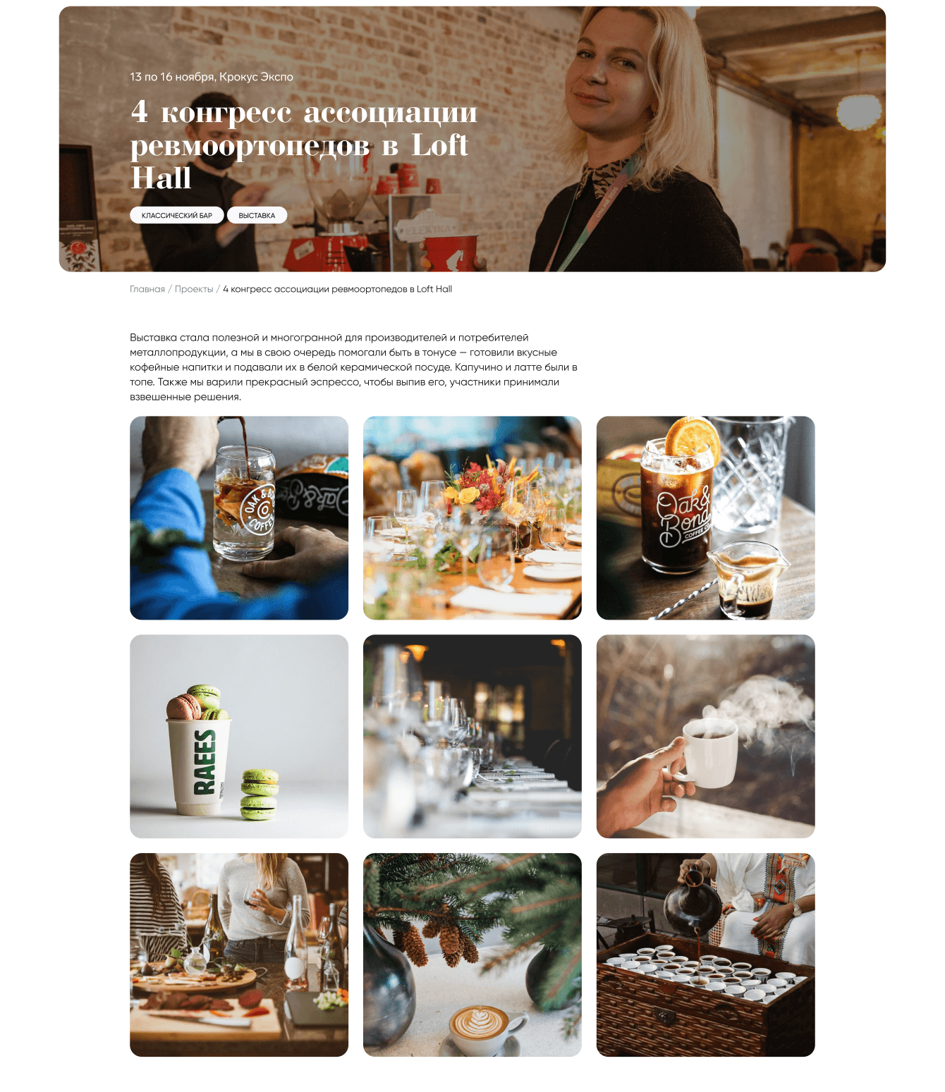 Каждая страница бара отражала настрой мероприятия. Мы создали структуру на раскрытие бара, его особенностей, а главное — сервиса и впечатлений, которые будут ждать клиентов на мероприятии. Для каждого бара мы подобрали контент из мероприятий и наполнили им структурные блоки, чтобы клиенту было не только полезно, но и вкусно знакомиться с будущими напитками.