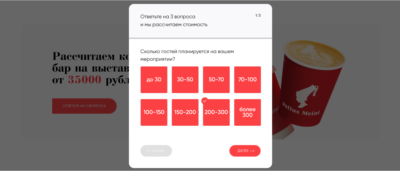 Так как компания позиционировал себя как место, где смогут собрать любой бар по желанию — поэтому важно было до начала звонка понять, какие важные критерии необходимы клиенту. Для этого мы продумали баннеры и CTR на сайте c квизом, где компания могла получать лиды с уже пониманием основных пожеланий по мероприятию, тем самым уже заранее могли выйти с предложением, которое было релевантно запросу клиента.