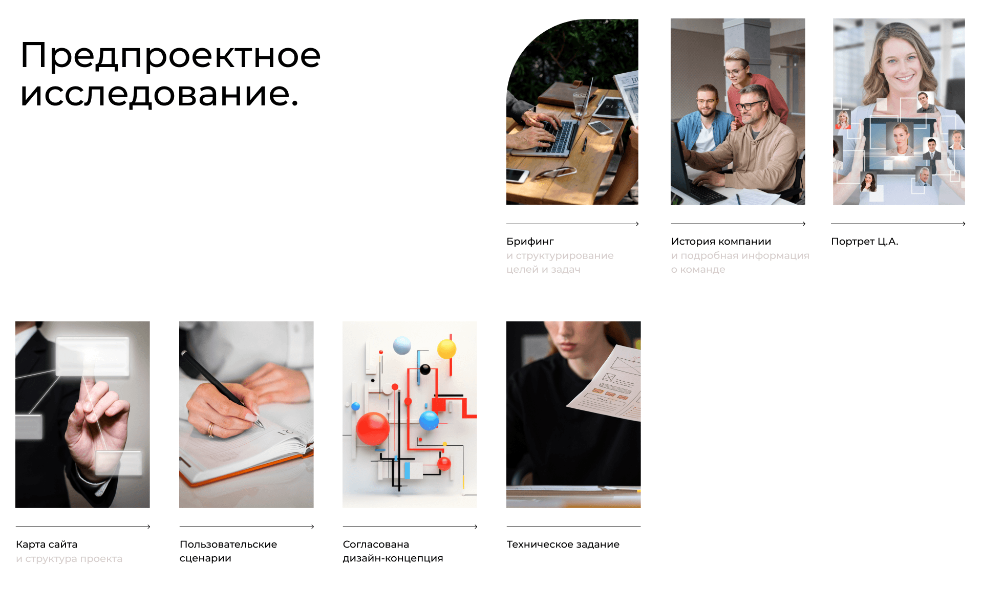 Исследование целевой аудитории. После знакомства с командой мы перешли к изучению целевой аудитории, что оказалось кропотливым, но крайне важным процессом. Мы поняли, что наш конечный пользователь — представитель крупного бизнеса, который реализует масштабные проекты, наполненные уникальным стилем и глубокой идеей. Такой пользователь, обладая изысканным вкусом и высоким уровнем требований, ставит перед сайтом задачу не только информировать, но и вызывать сильные эмоции, вдохновлять на новые свершения.