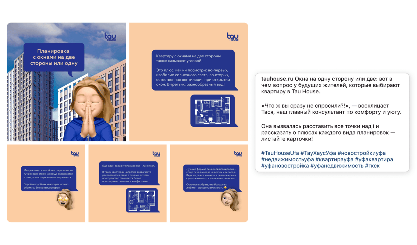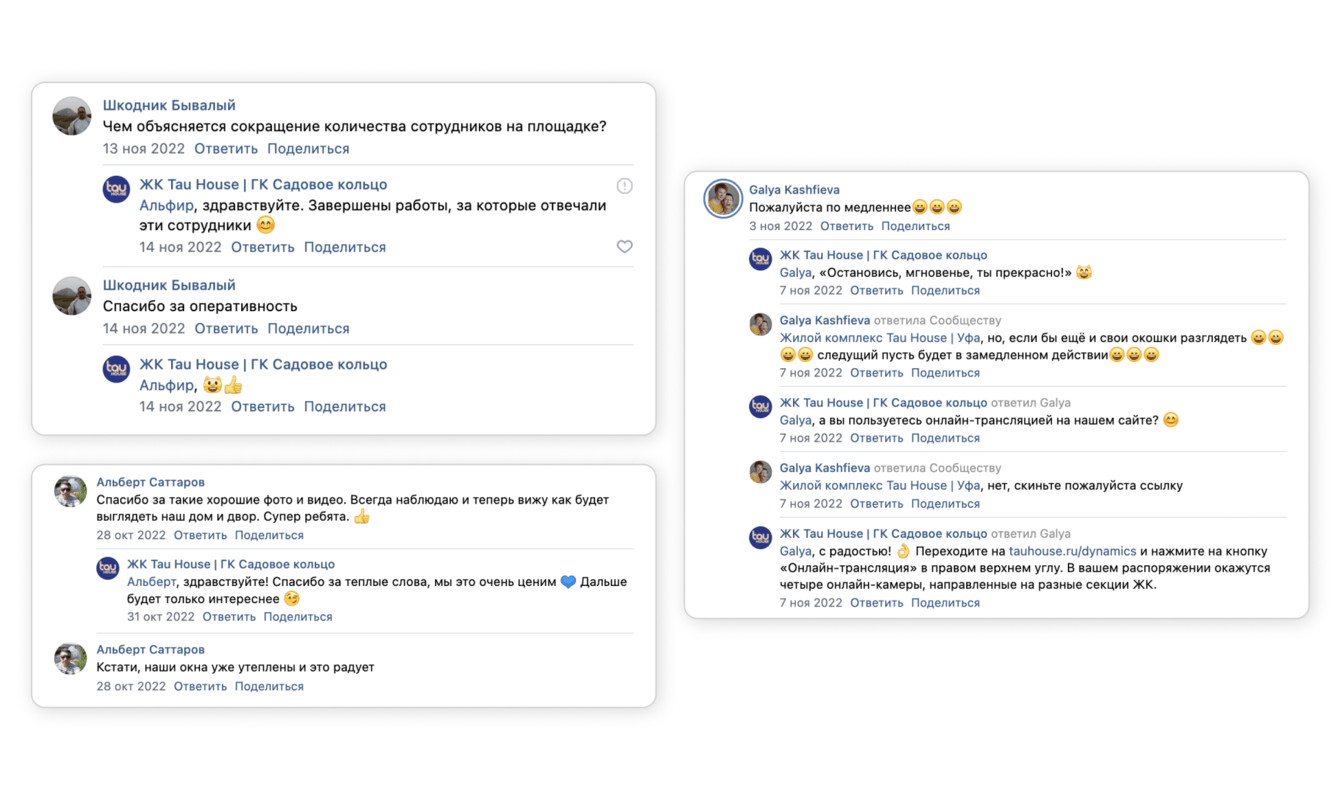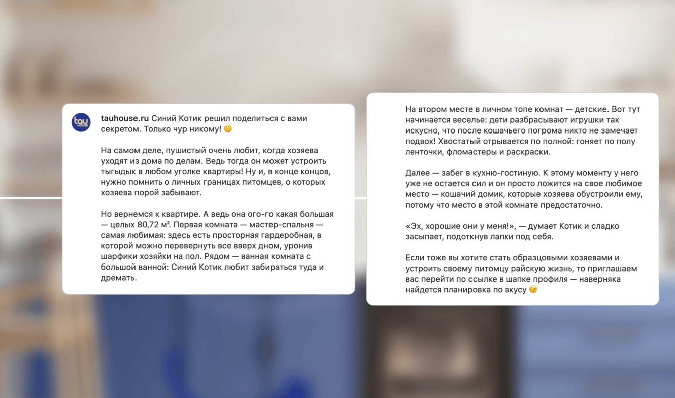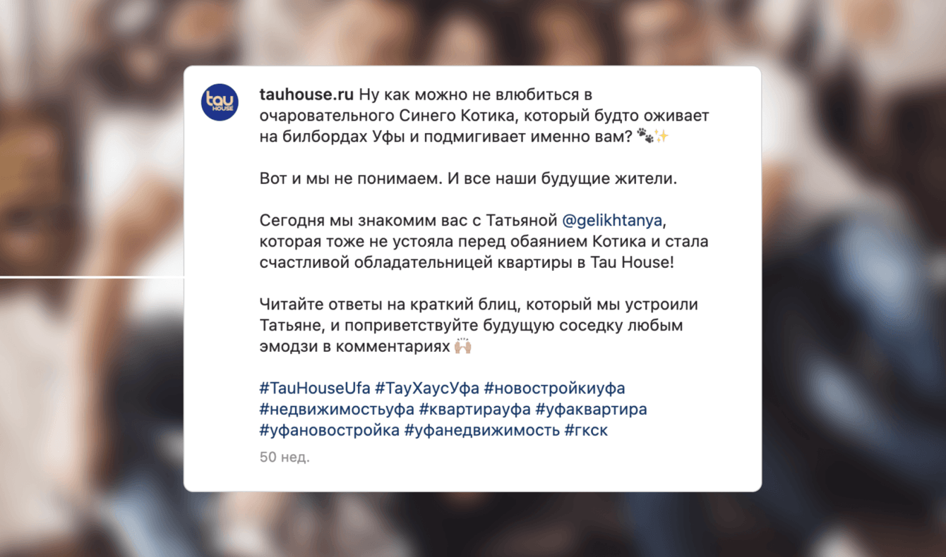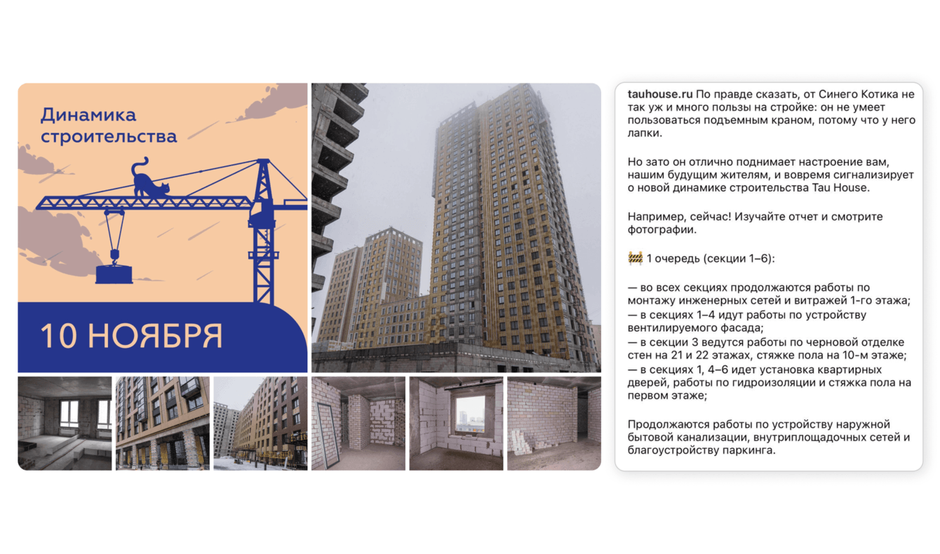 С помощью честного и открытого диалога мы наладили особую связь с подписчиками. Они воспринимают публикации Tau House как беседу с хорошим приятелем, а не как коммуникацию «девелопер — дольщик».