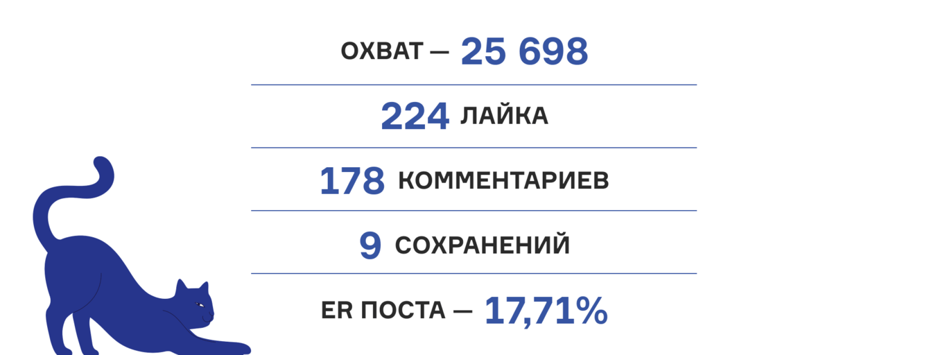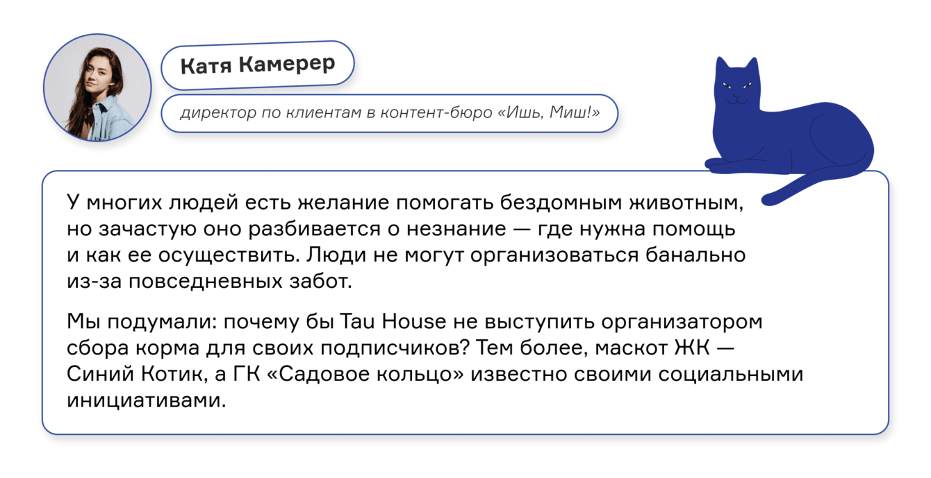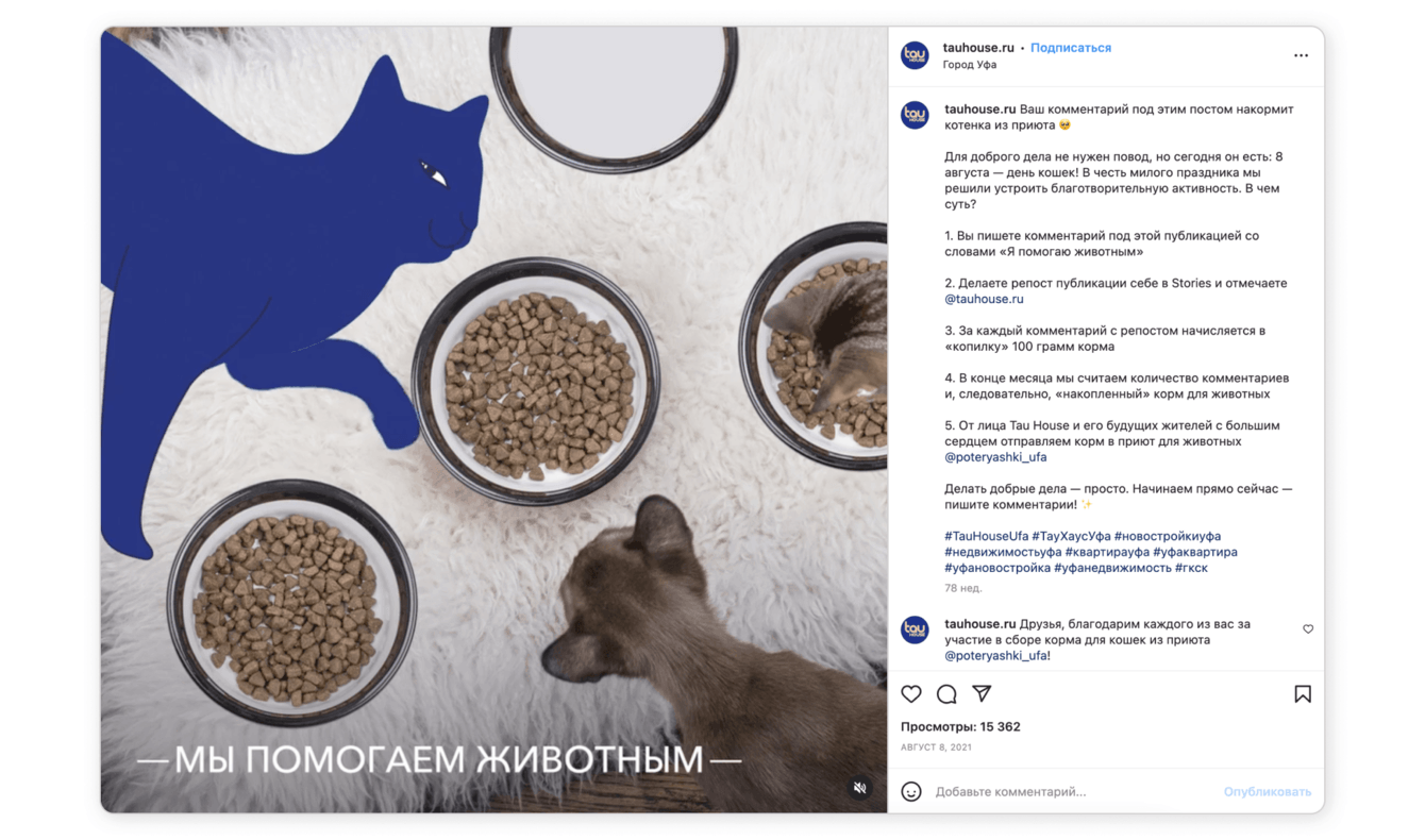 Дальше согласовали идею и определились с механикой конкурса: каждый комментарий под публикацией девелопера и репост в Stories добавлял в «копилку» 100 грамм корма для котят из приюта.