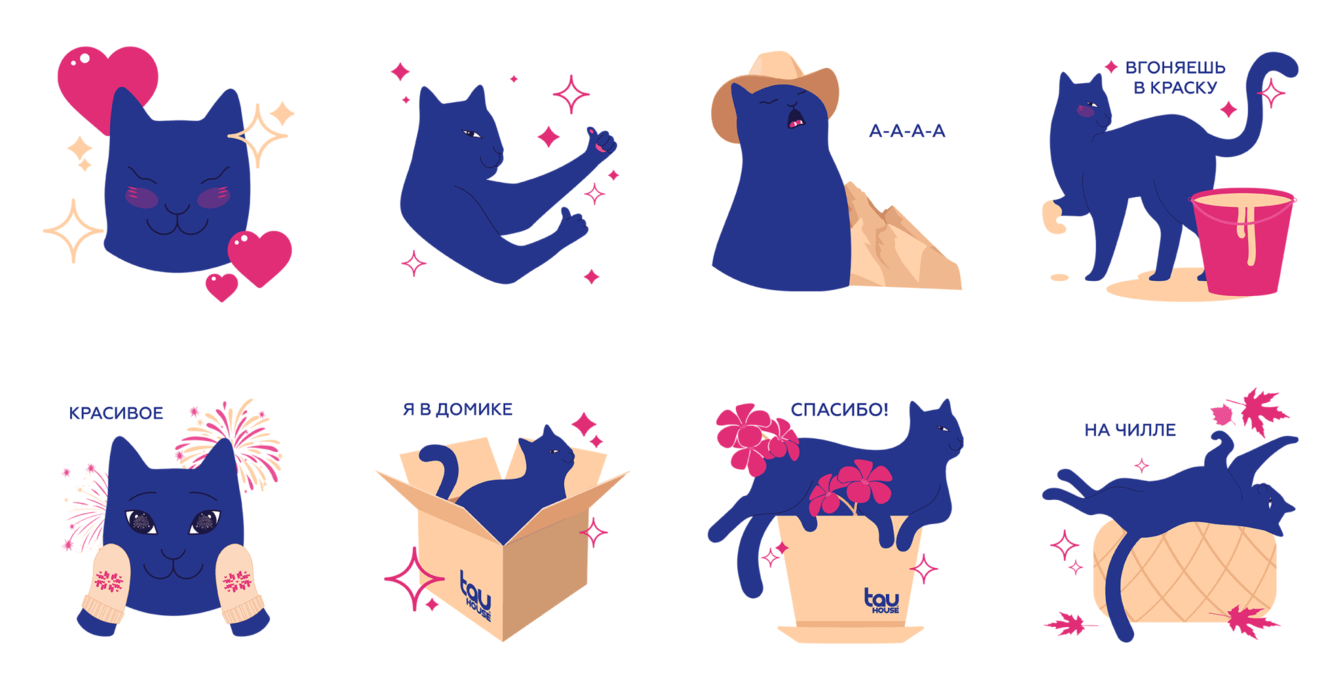 «Коллеги, нам срочно нужен стикер-пак!» — именно такая мысль посетила команду бюро на одном из брейнштормов. Ведь Синий Котик будто настоящий: в публикациях Tau House он вальяжно гуляет по стройке, контролирует рабочих и делится полезными лайфхаками.