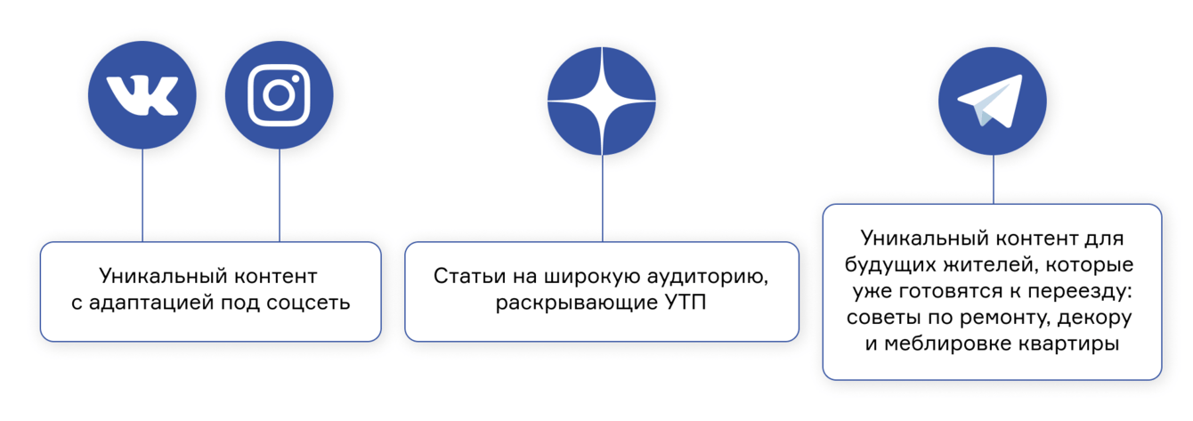 С помощью стереоконтента сформировали единую коммуникацию, распределив задачи по каналам: ВКонтакте, Instagram*, Telegram и Дзен, каждый из которых дополняет друг друга. Так мы даем потенциальному покупателю максимум разноформатной информации, которую он может получить в привычном формате через знакомые источники.