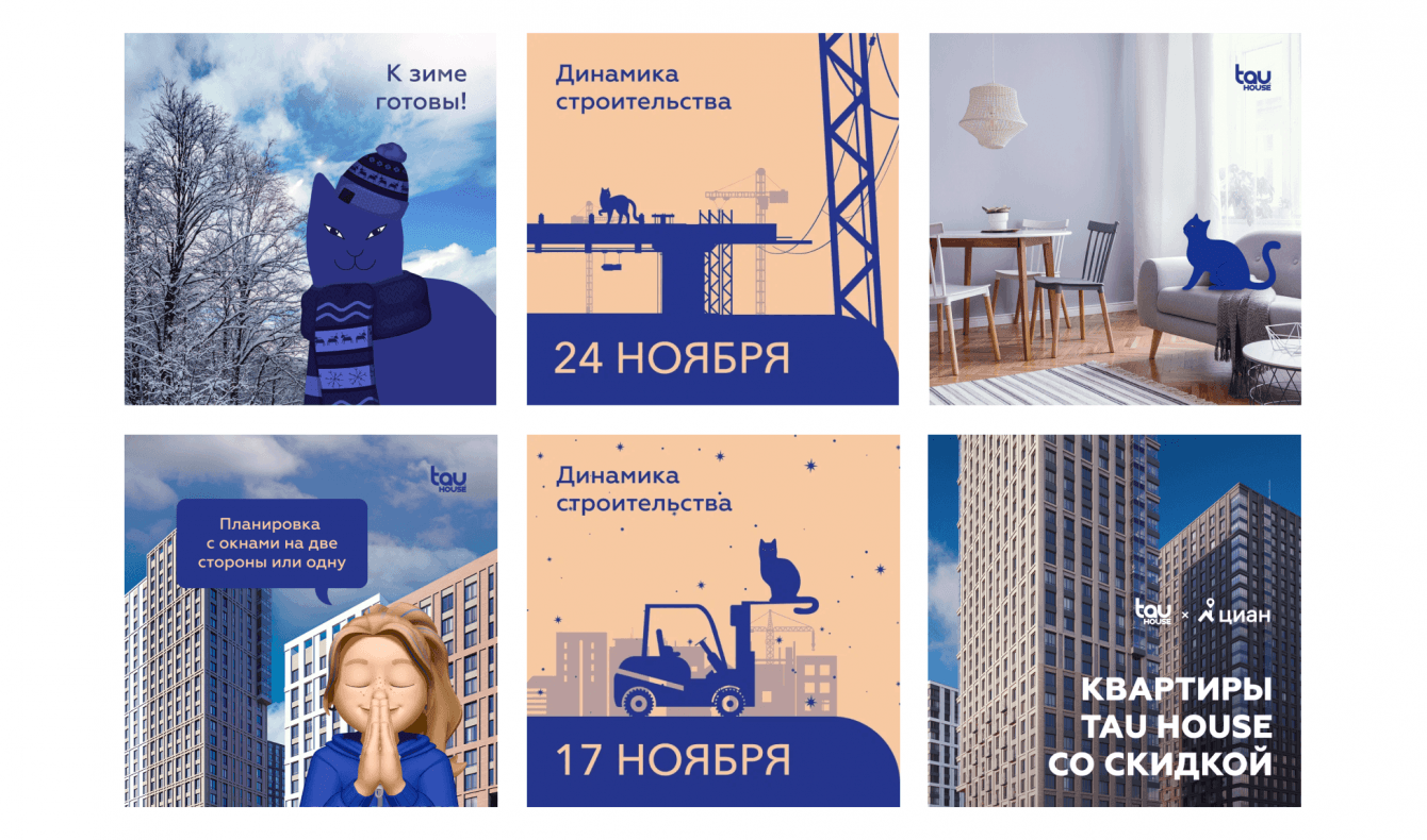 Наша главная цель — качать бренд Tau House креативными публикациями и продавать квартиры с помощью милого маскота. Высокие цели включают в себя и KPI по подписчикам. Тут важно было не только аудиторию привлечь, но и в стиль проекта попасть.