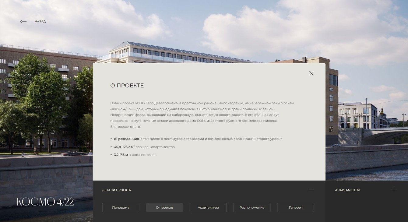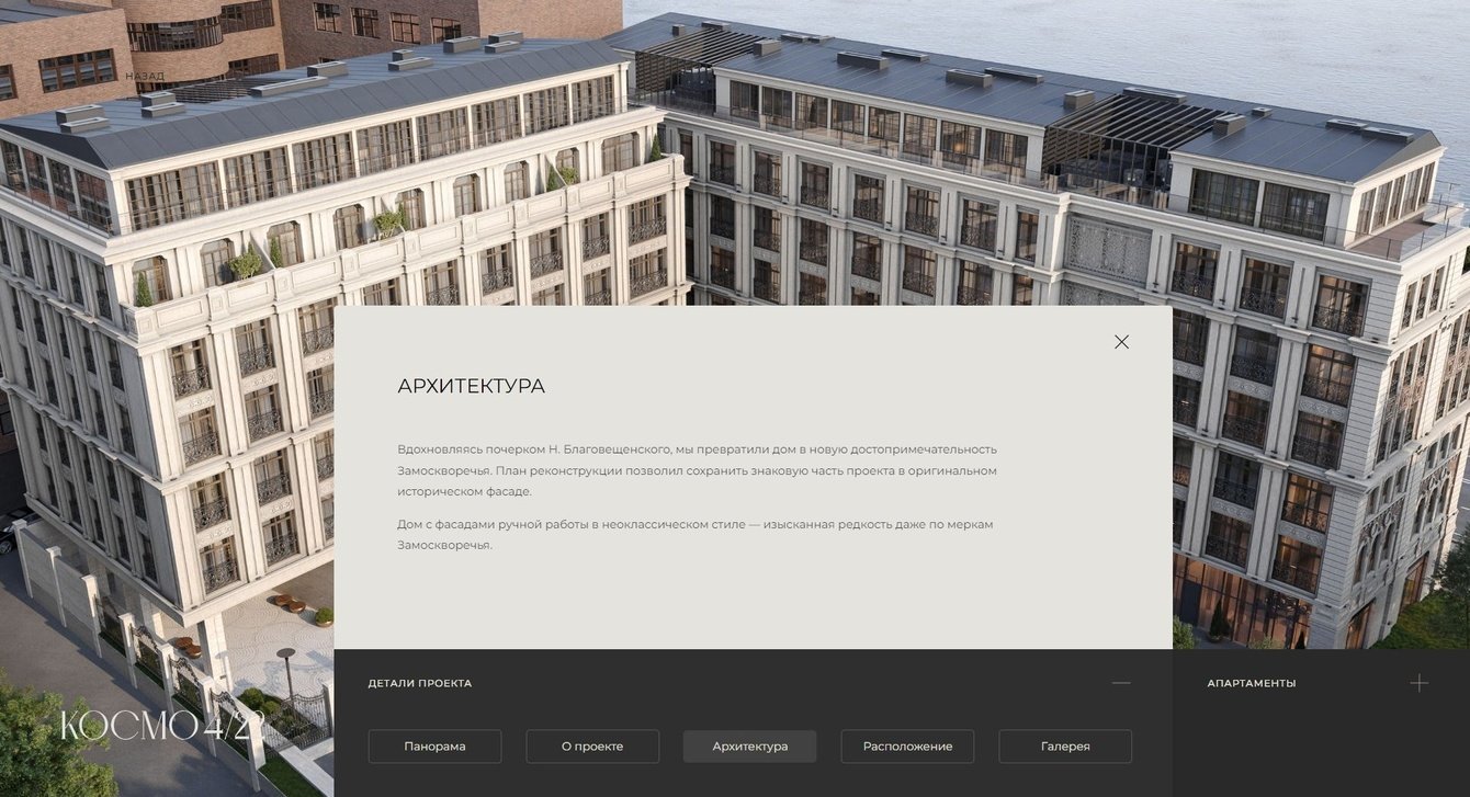 Архитектурный фильм – путешествие на остров Балчуг, в клубный дом на Космодамианской набережной «Космо 4/22» – гармоничное сочетание классики и современности. Здесь современный стиль респектабельных кварталов благородно оттеняется изящными архитектурными традициями XIX-XX веков – проекта 1901г. известного русского архитектора Николая Благовещенского.