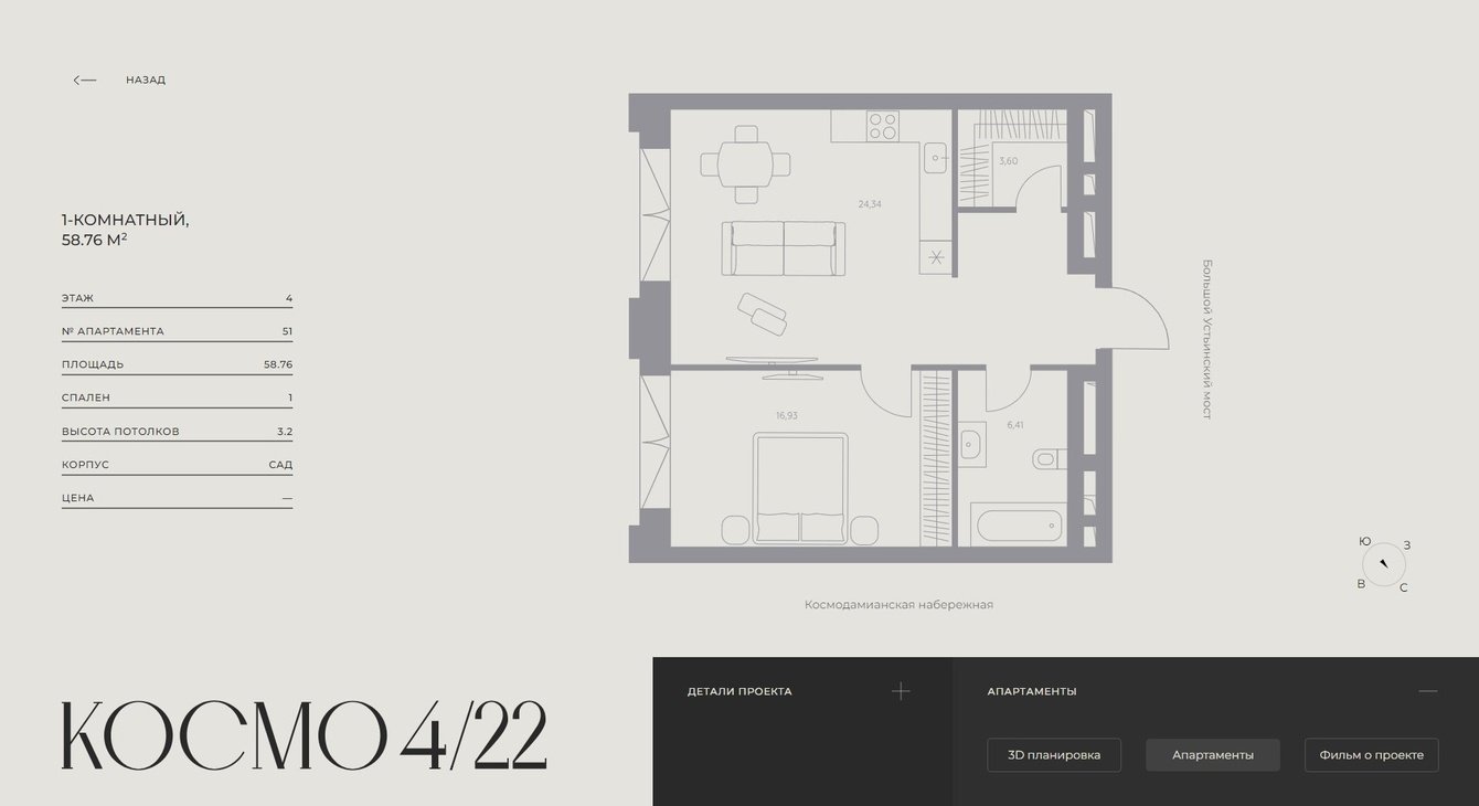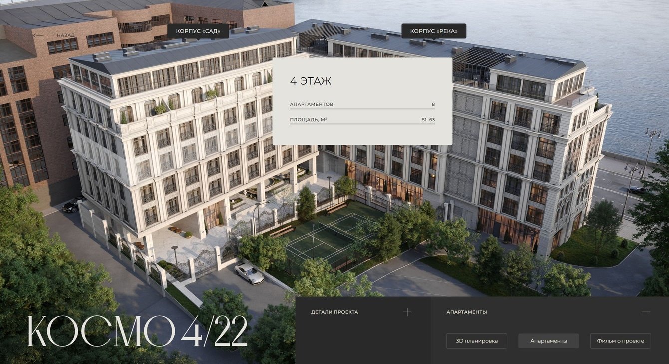 В процессе работы над интерактивной презентацией был создан проект клубного дома, состоящий из двух корпусов-“САД” и “РЕКА” и разработан функционал: