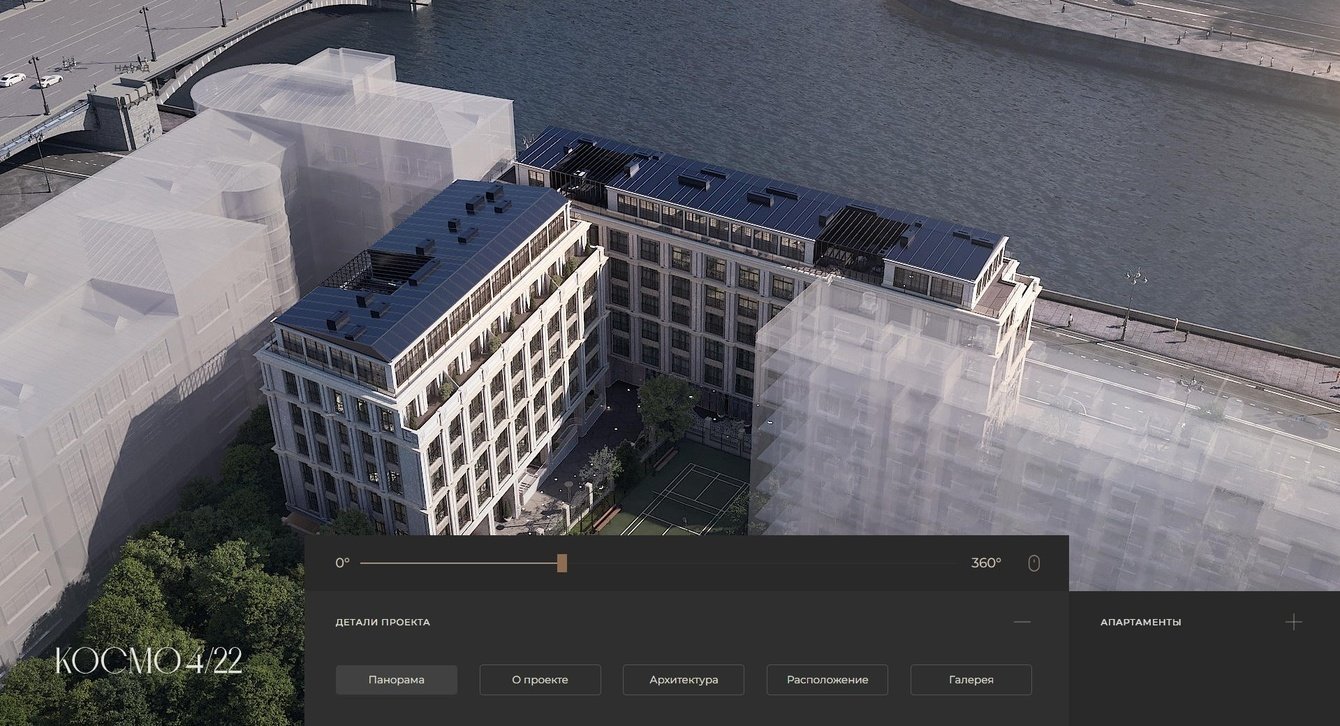 Совместно с нашими кинопартнёрами мы отсняли кинематографическое видео на месте строительства проекта с квадрокоптеров и в дальнейшем совместили с компьютерной графикой – 3D-анимацией. В итоге, благодаря работе наших специалистов по 3D-анимации и постпродакшена мы получили красивейший таймлапс, раскрывающий невероятную архитектурную красоту и атмосферу места.