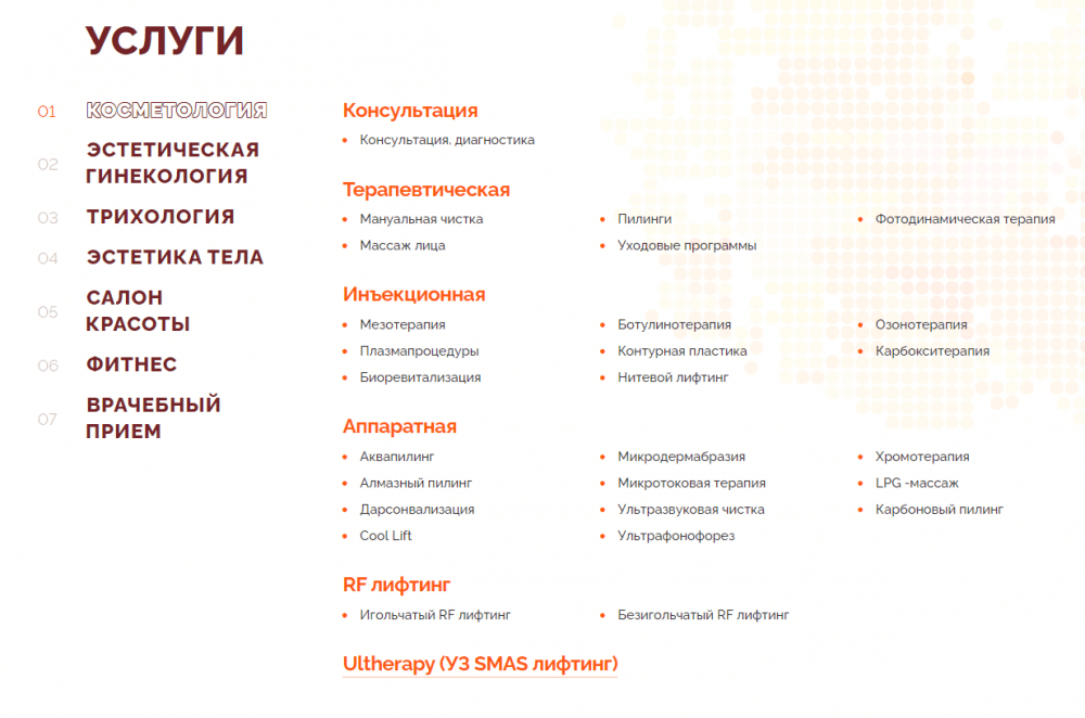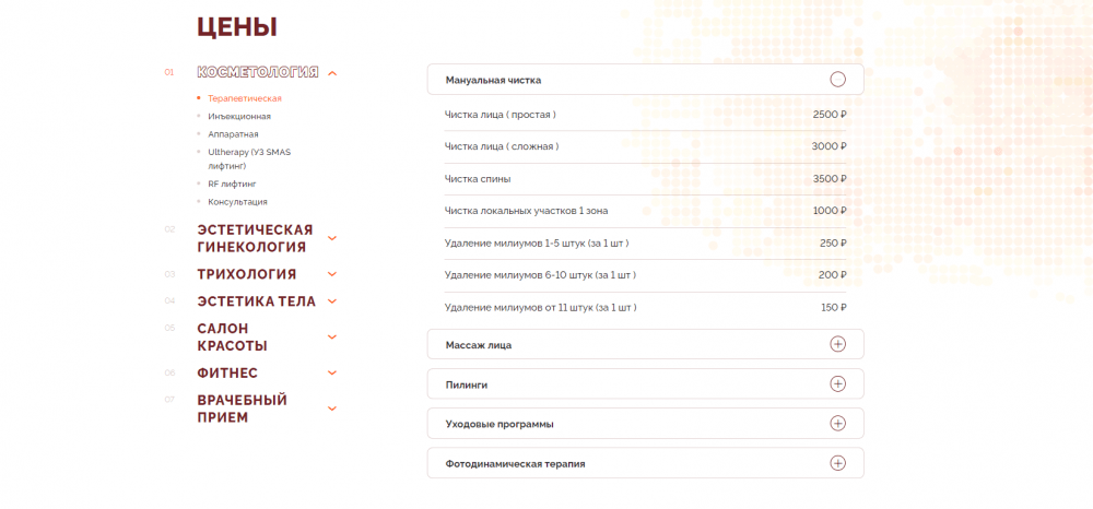 Частая ошибка здесь — размещать таблицу или текст со всеми услугами подряд. Лучше использовать разбивку по видам и группам процедур с разворачивающимися списками.