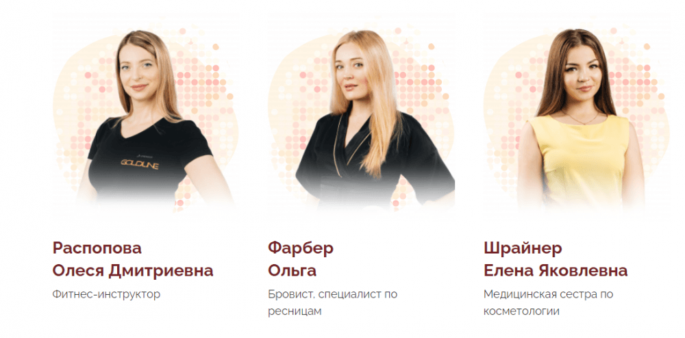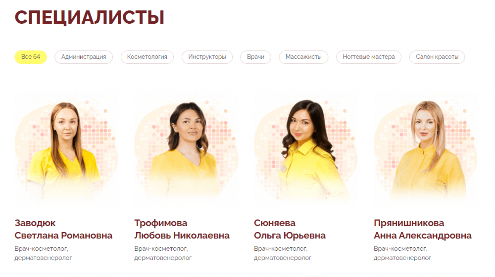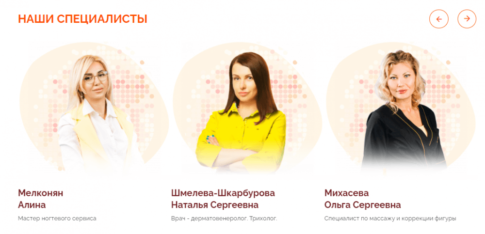 Отдельное внимание на сайте уделили мастерам, врачам и тренерам. Пользователям важно знать, в чьи руки они отдают свое здоровье, лицо и тело. Если речь идет о косметологии, то клиенты могут размышлять так: если у специалиста гладкая идеальная кожа, то он сможет сделать то же самое и со мной.
