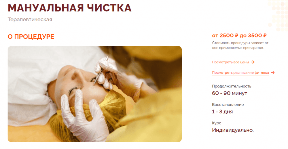Чтобы пользователь легко считывал информацию, мы визуально выделили ключевые моменты по услуге отдельно от основного текста — справа находится блок со стоимостью, продолжительностью, длительностью восстановления, рекомендуемым курсом и специалистами, которые выполняют процедуру.