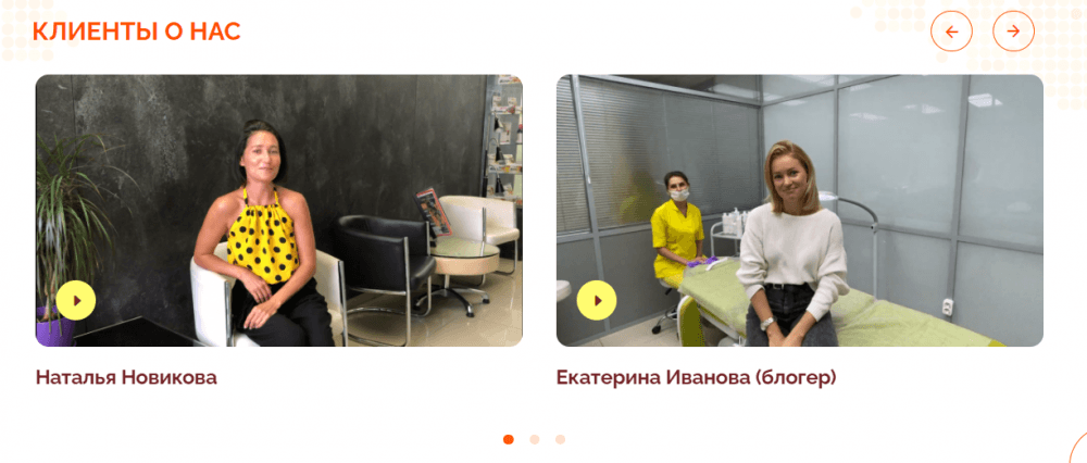 Для повышения статусности бренда мы разместили на сайте видеоотзывы от медийных персон и популярных блогеров города. Дополнительно разместили ссылку на Flamp.ru, где у компании размещено большое количество отзывов от клиентов.