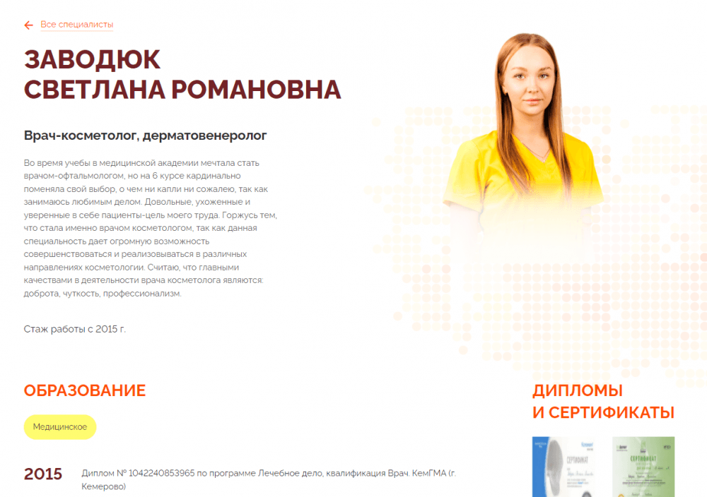 Чтобы сформировать доверие пользователей к персоналу центра, для каждого сотрудника были созданы отдельные страницы со следующей информацией: