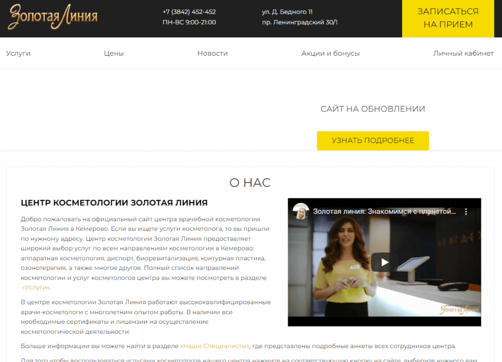 «Золотая линия» — это косметологический центр с филиалами в Санкт-Петербурге, Новосибирске и Кемерове. В них представлено огромное количество услуг по разным направлениям: косметология, салон красоты, фитнес-центр, эстетика тела, врачебный прием.