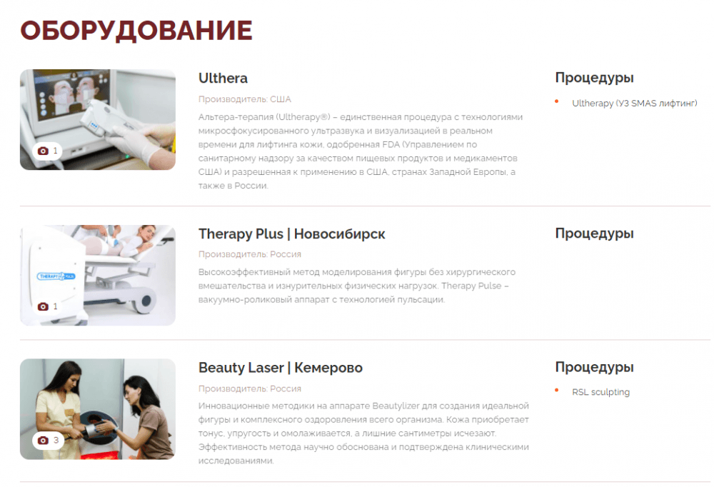 По поисковым запросам можно сделать вывод, что пользователи интересуются в том числе оборудованием косметологических центров. На сайте «Золотой линии» мы вынесли эту информацию в отдельный раздел — новейшие методики и аппараты являются гордостью центра и его конкурентным преимуществом.