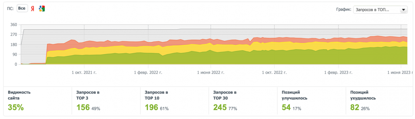 3. Благодаря оптимизации и улучшению контента, мы значительно увеличили количество запросов как в ТОП10, так и в ТОП3.