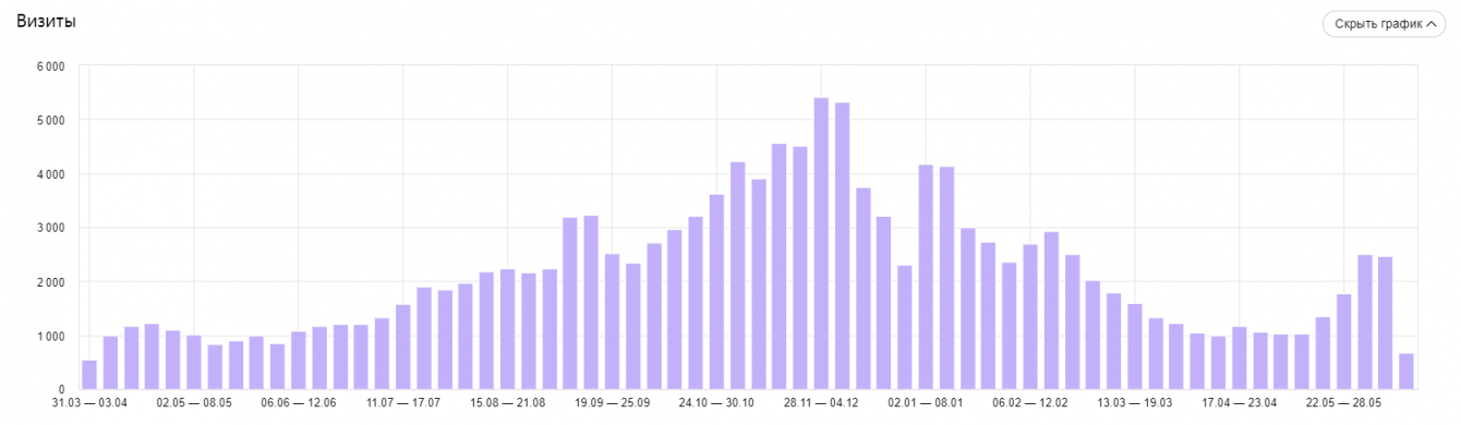 1. В результате нашей работы среднемесячная посещаемость сайта в высокий сезон увеличилась более чем в 4 раза.