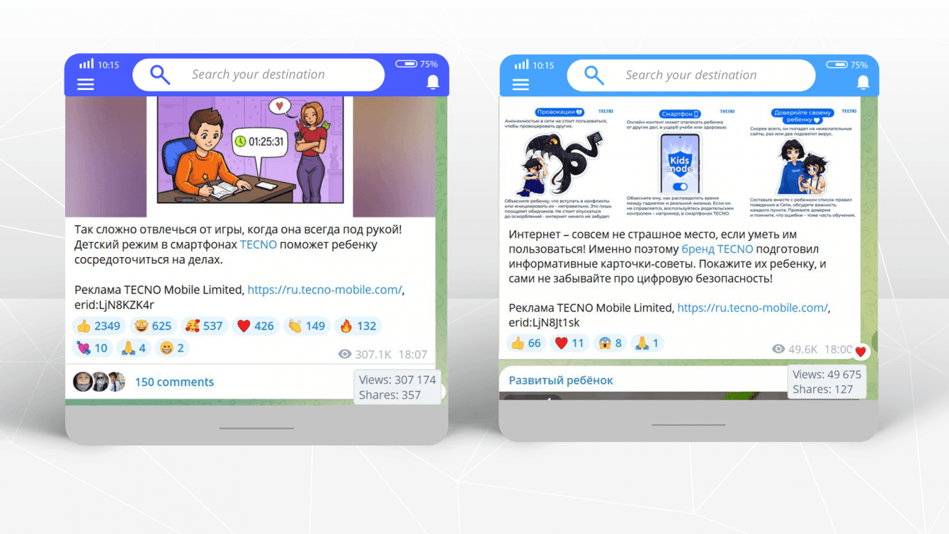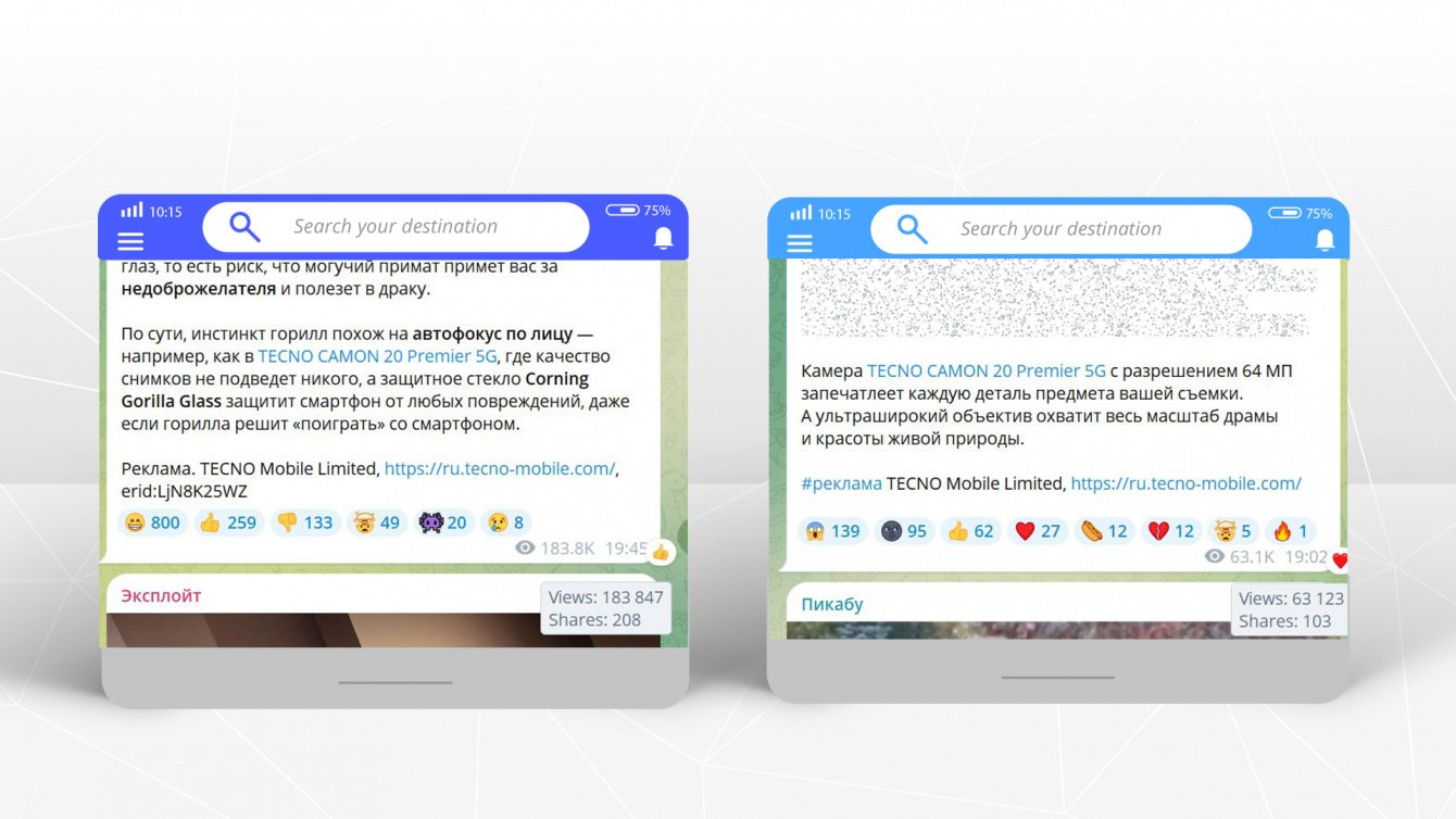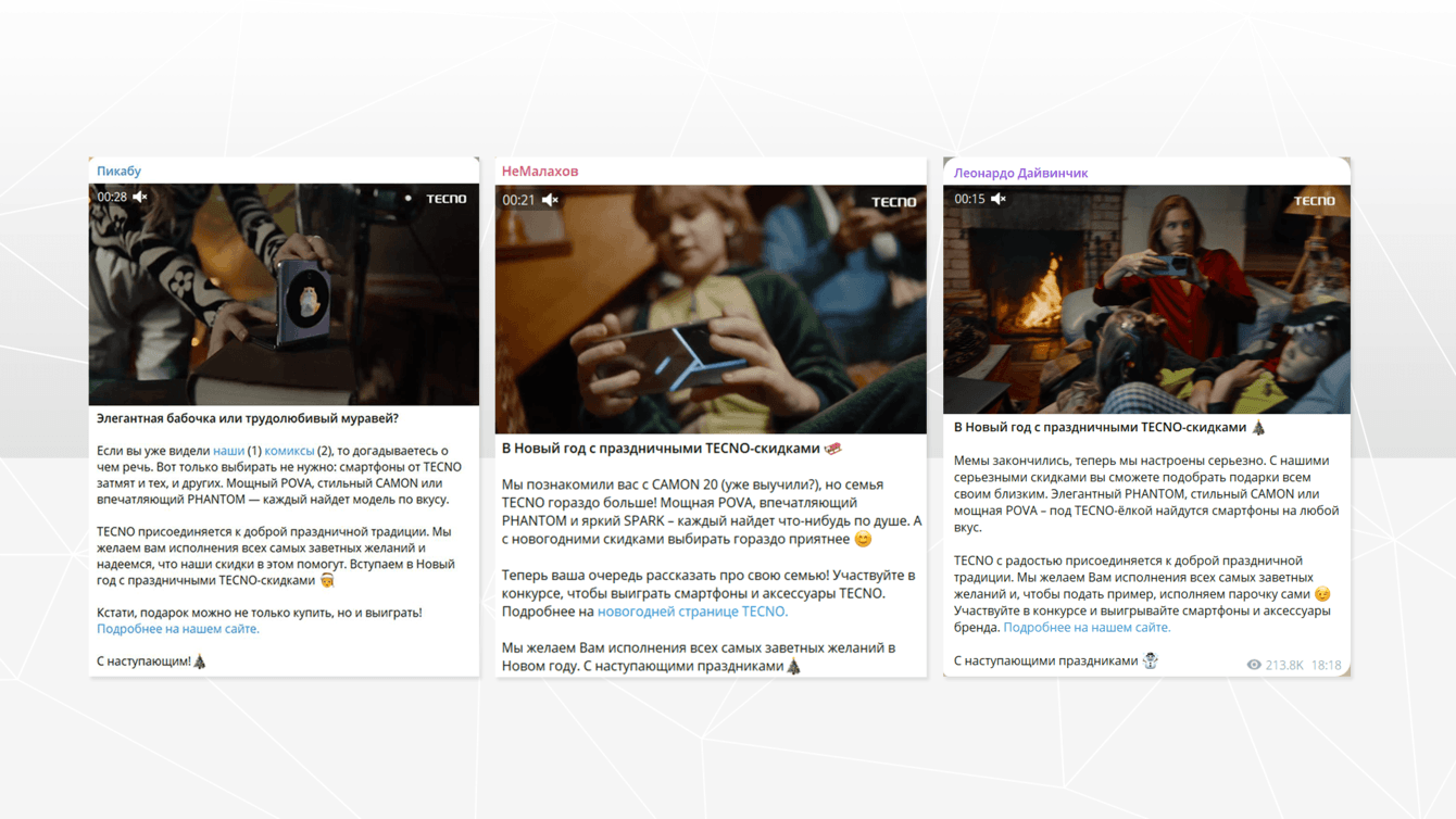 Нужно было привлечь внимание аудитории к бренду TECNO за счет креативных и цепляющих постов. Цель кампании – повышение узнаваемости бренда и лояльности пользователей, а также прогрев аудитории к предновогоднему промо.