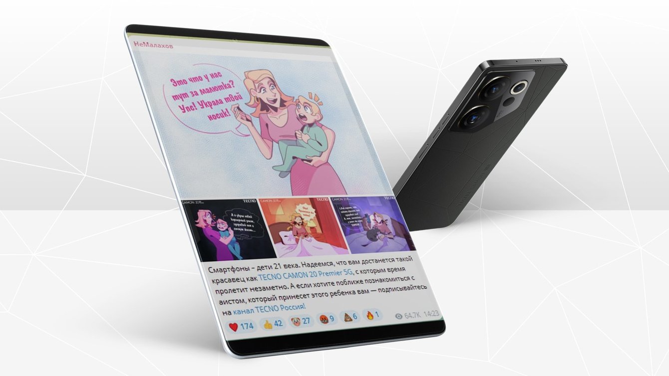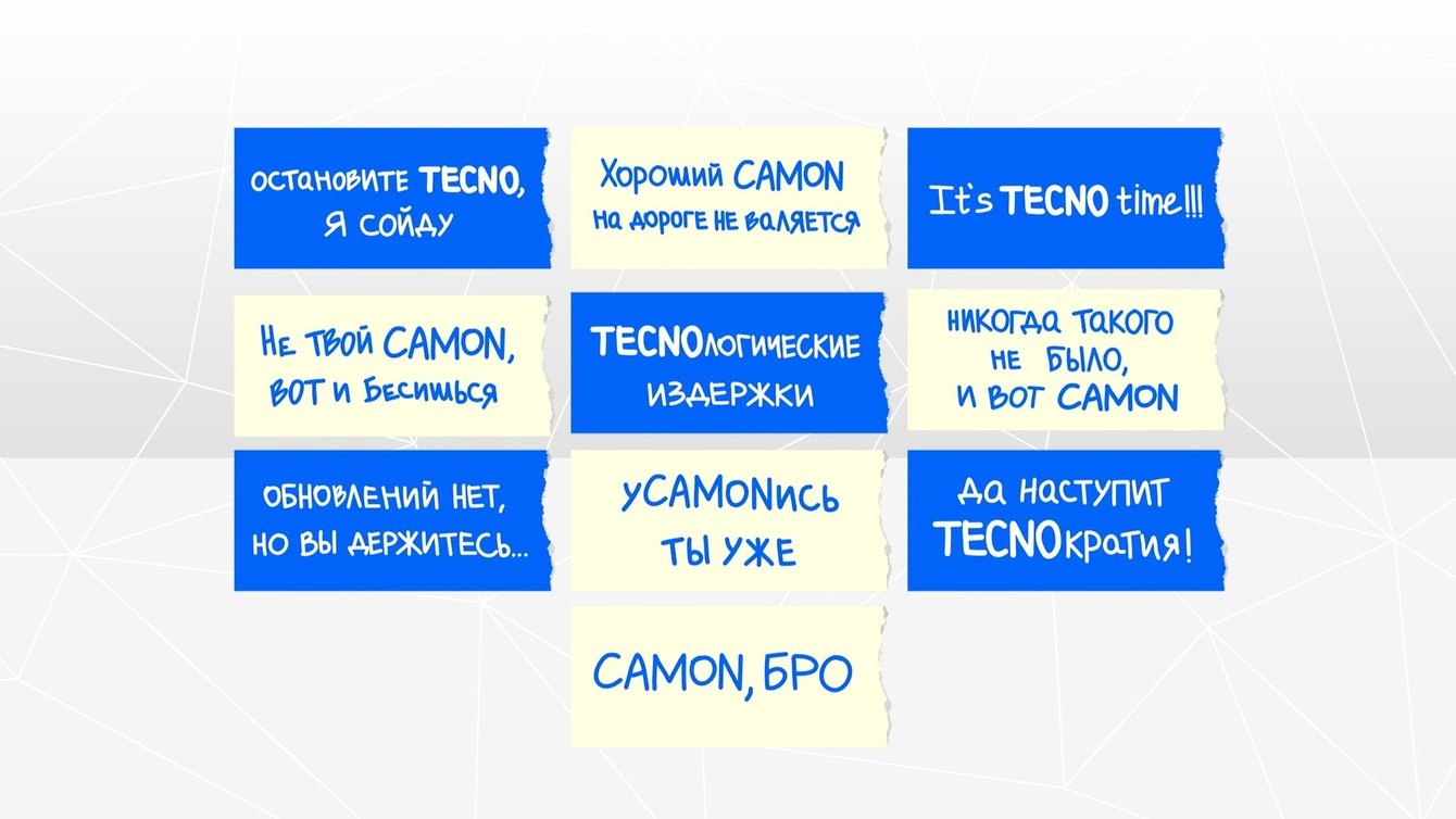 Получилась коллекция демонстративно неуклюжих, но милых и забавных каламбуров, которыми охотно пользуются подписчики официального канала TECNO (а заодно и наша собственная команда на пару с PR-отделом бренда).